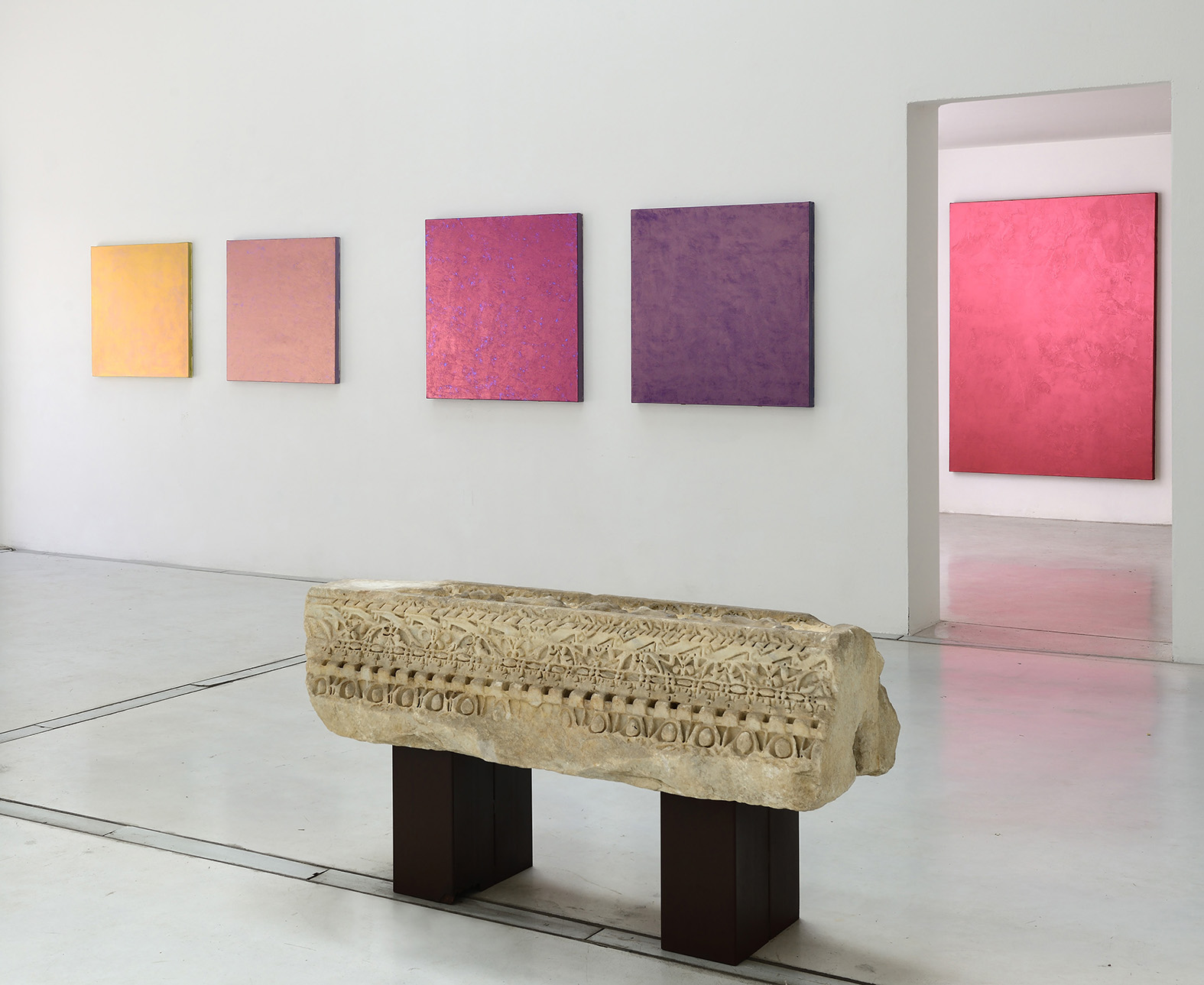 Sia la pittura interferenziale di Simpson, con i suoi riflessi cinetici, che le sculture antiche sapientemente cesellate, rivelano un comune sistema di segni e significati, quasi una sorta di cifrario usato per la loro creazione, da codificare secondo il periodo storico in cui sono state realizzate», ha ricordato la galleria.