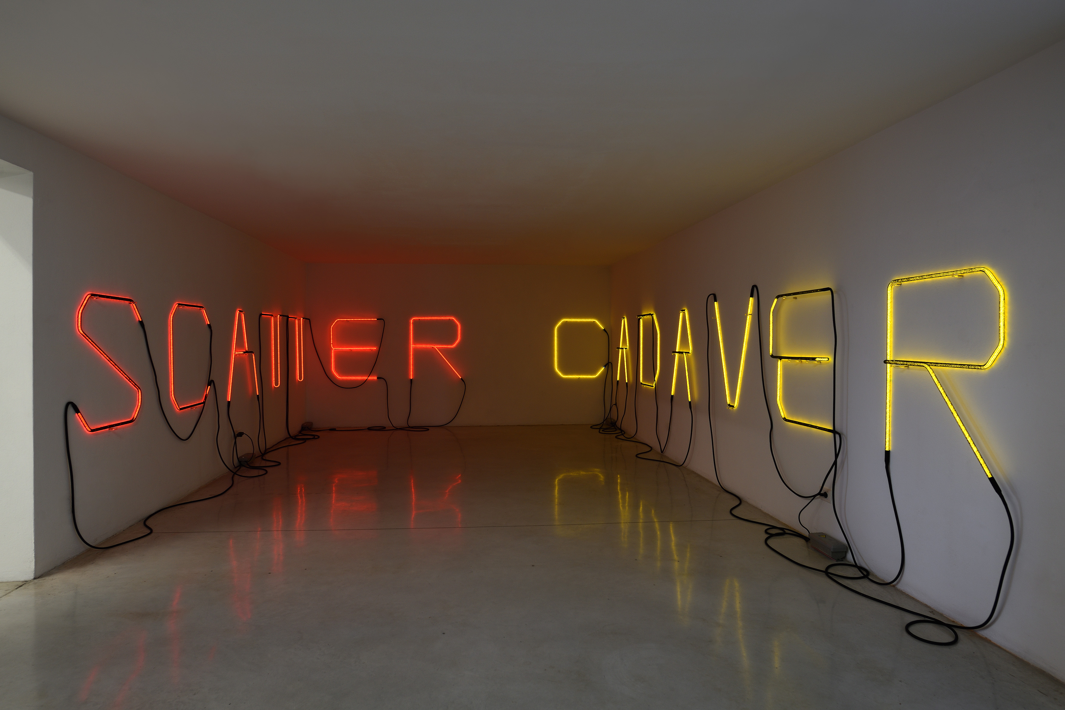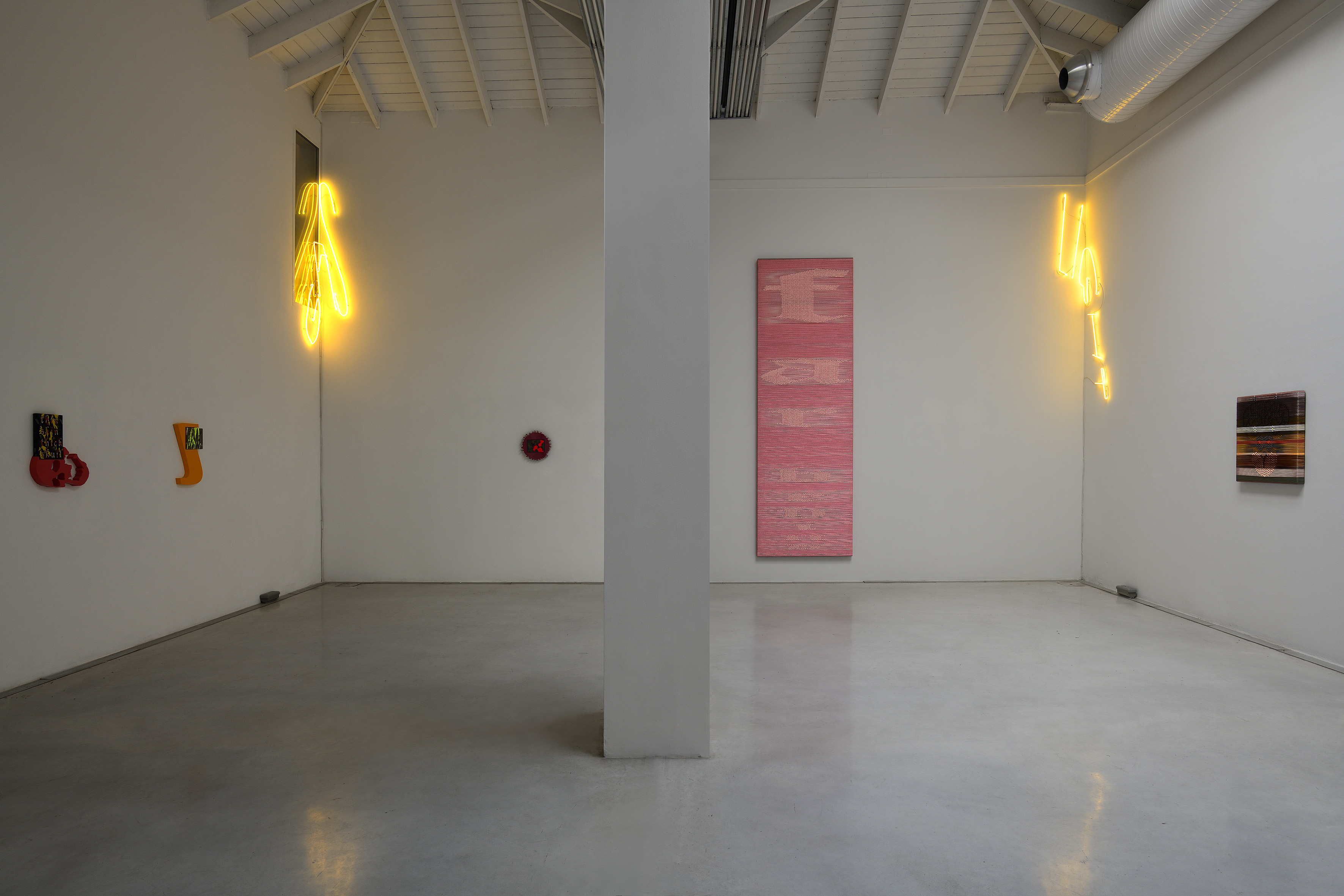 «In questa mostra il lavoro di Arthur Duff (1973, Germania) viene proposto nella sua totalità attraverso nodi, ricami, neon, oltre ad una serie di 90 piccoli dipinti realizzati durante il lockdown. É il fluire costante di una ricerca che si fa energia ed azione. Sono le trame dell’arte che trovano una loro rinnovata configurazione mettendo in crisi logiche aprioristiche e formali. […] In questo ricco allestimento (Duff ha dichiarato di essere stato colto da una fase creativa molto prolifica) alcune opere più datate sono state attualizzate per assumere nuove forme e significati. Un vecchio telaio del 2005, esposto durante ArtBasel e mai più riproposto, viene qui montato e sovrapposto ad una nuova struttura di oltre 3 metri, mentre l’opera Scatter Cadaver, una scritta al neon rivestito da guaina in poliestere, occupa in maniera inconsueta l’intera drawing room della galleria. Anche Gas Light, lavoro realizzato da Arthur Duff nel 2012, ha una nuova veste […].