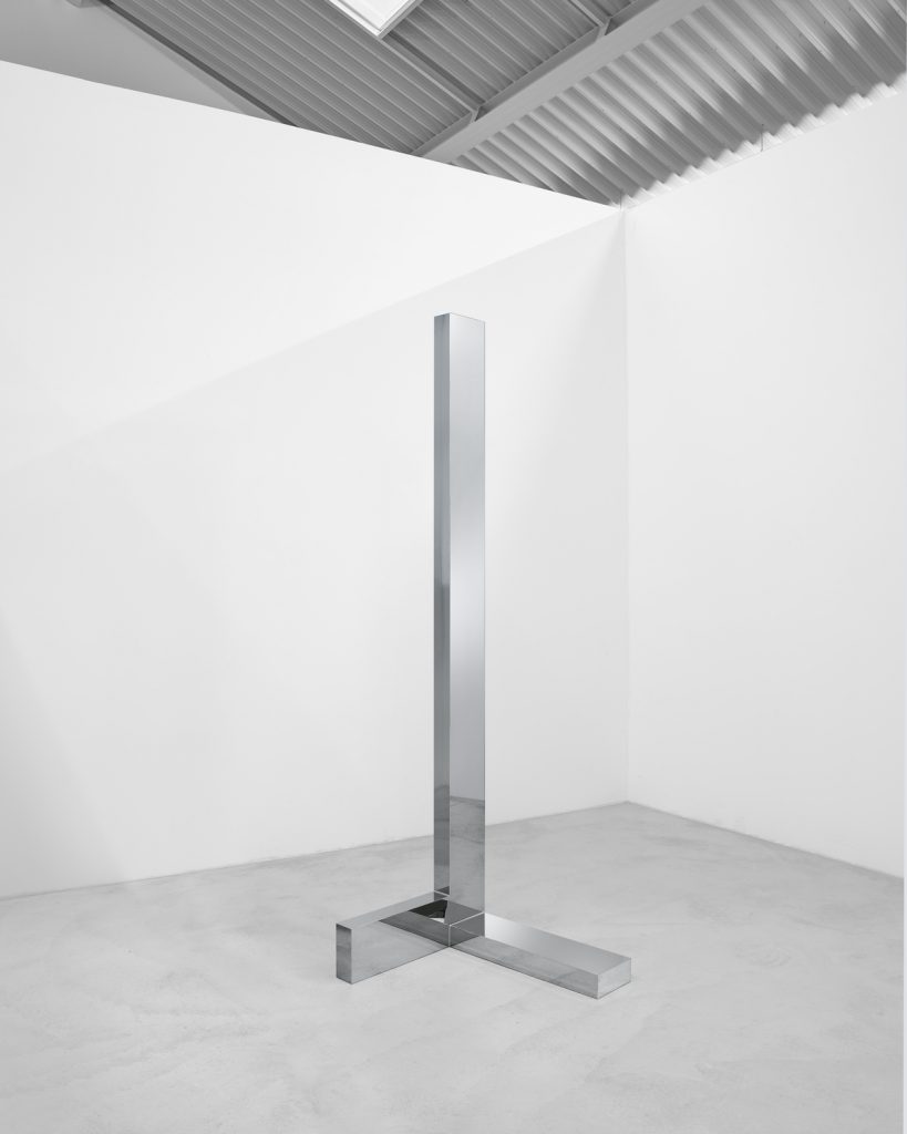 Verstärker (amplificatore), ad esempio, una scultura in acciaio inossidabile lucidato posta liberamente nello spazio, apre di certo non verso qualcosa di ignoto o di non visto, ma tende ad allargare la conoscenza che possiamo avere dell’intorno. A tal punto che la silhouette dell’opera, ora mimetizzata dalle sue stesse trame specchianti, sembra dare ossigeno alla costrizione dell’ambiente. Lo studio di un lavoro che non abbia più una demarcazione stretta tra ciò che è illusorio e ciò che possiamo riconoscere come reale raggiunge, pertanto, la vetta del paradosso.