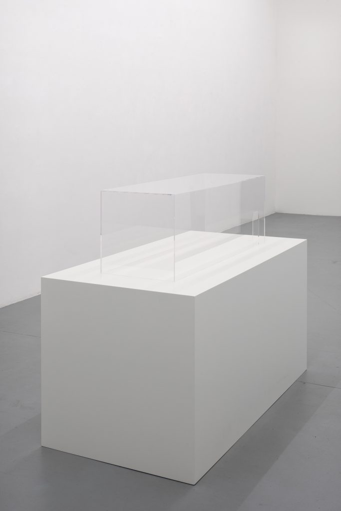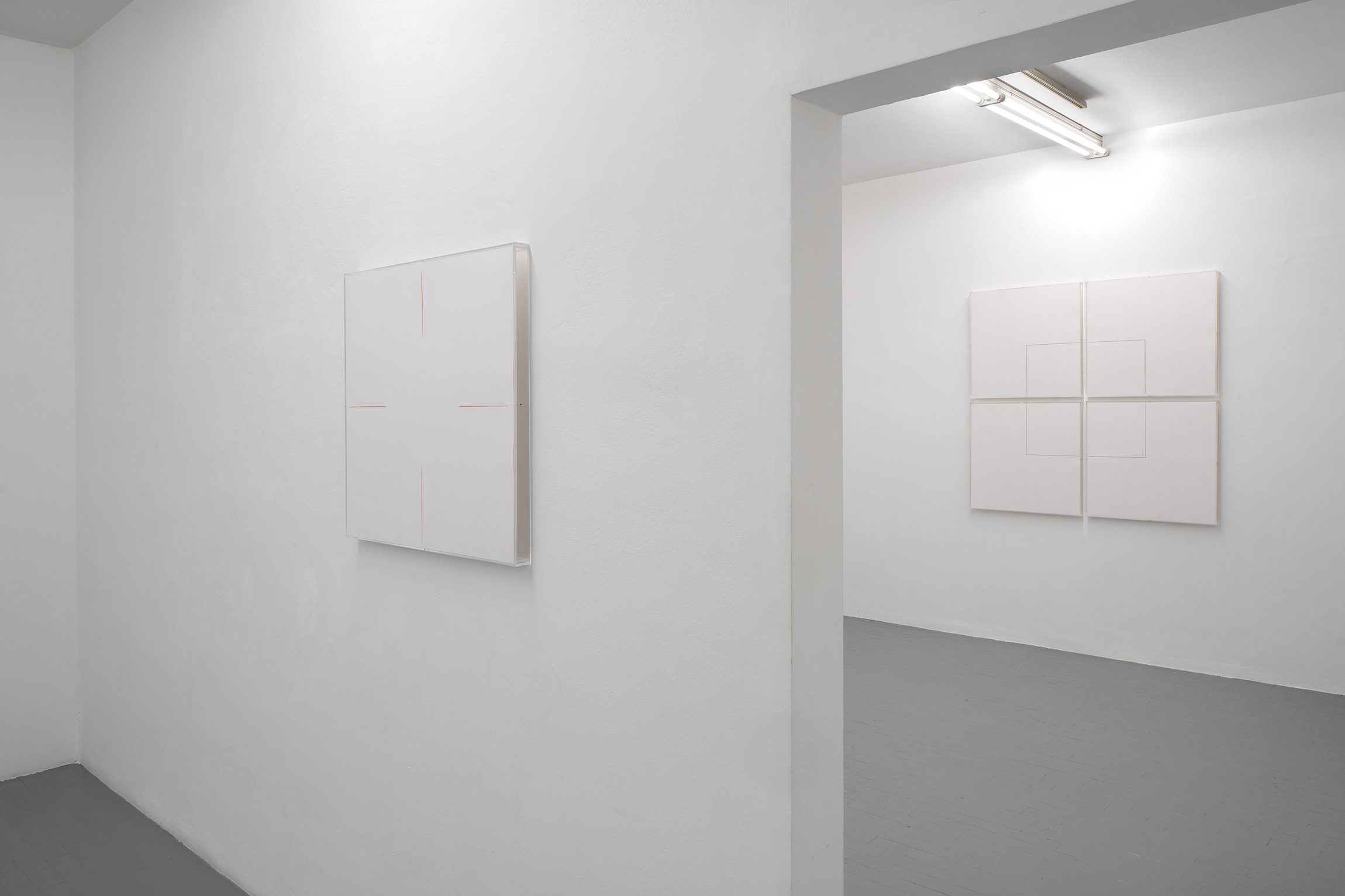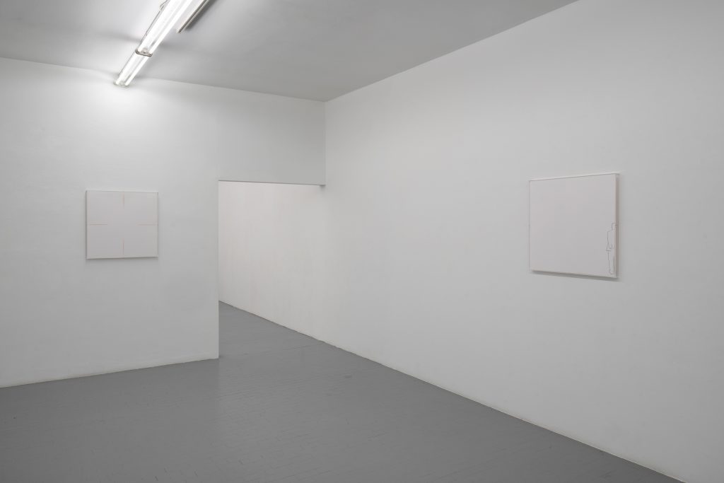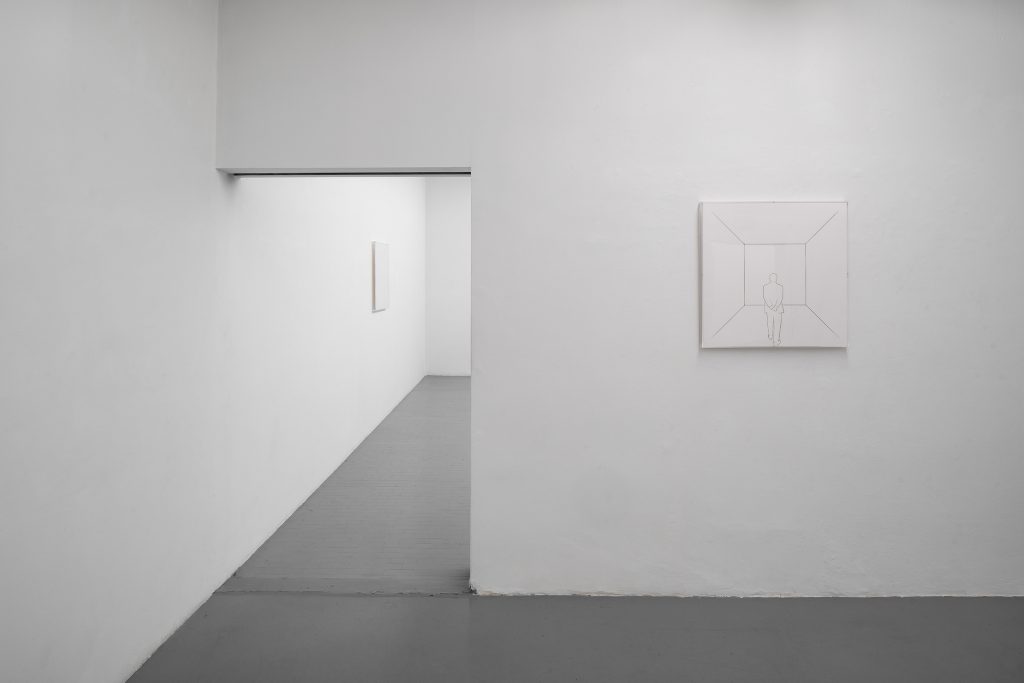 Ma per questa tappa gli ha fatto una specifica richiesta: «Voglio una mostra immateriale. Non è rarefazione, è sottrazione. Molto bianco e qualche segno. Non volevo troppo. E allora all’entrata, nella prima sala, c’è un solo un parallelepipedo di plexiglas che ricorda galleria, e qualche altro pezzo. Ma pochi però». Meno colori, meno plexiglas, no installazioni. «Una mostra molto rarefatta. Anche troppo», scherza Giulio Paolini. «È una mostra che mostra nient’altro che se stessa. Tutta la galleria è l’opera d’arte. Suggerisce un percorso lungo il quale lascia tracce in successione: nella prima sala c’è un solo quadro alla parete. Nella seconda stanza le opere presenti riportano quanto hanno appena “visto” nella stanza precedente. E la stessa cosa avviene tra la seconda e la terza dove ci sono tre immagini che si schierano davanti a “riflettere” su quanto visto nella sala precedente. Nella quarta stanno insieme le opere nelle tre sale che abbiamo appena attraversato. Dimenticano la loro collocazione precedente e si riuniscono in un’unica rappresentazione. I quattro quadri danno luogo ai quadri precedenti. Ogni sala, insomma, riferisce un secondo tempo di quanto visto nella sala precedente. Di sala in sala si registra quello che hanno visto in quelle prima. C’è la figura tracciata sul muro della prima sala che sembra aver compiuto la visita e poi torna indietro». Quella sagoma di un uomo di spalle è la stessa che si presenta in tutte le sue opere, ovvero se stesso: Giulio Paolini, appunto. Ecco come la descrive: «Per una teoria generale della vita: noi non possiamo sottrarci all’attrazione per il dopo, ma si deve aspettare da fermi. Questo spiega perché la figura è sempre la stessa che si colloca in un modo immobile». (È la sagoma tratta da una foto che gli è stata di spalle quando stava andando a visitare la mostra di Anselm Kiefer all’Hangar Bicocca).