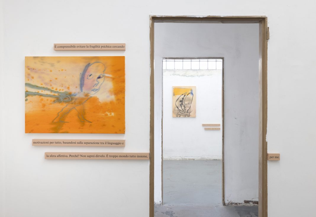Dai colori saturi, salendo le scale, si passa quasi a un monocromo, con la mostra polifonica di Camille Henrot e Estelle Hoy, avvolta dal profumo di un aranceto. Jus d’Orange, progetto espositivo accompagnato da una pubblicazione, è l’esplosione nello spazio del corrispettivo editoriale. L’intervento curatoriale di Chiara Nuzzi, che si riflette anche nelle pareti dipinte nelle tenui tinte dell’alba per mantenere il continuum tra carta stampata, muri perimetrali, opere pittoriche e testo scritto, sostiene perfettamente il dialogo profondo tra le due artiste. Le opere di Henrot restituiscono immagini bizzarre, grottesche e irrazionali, così come la nostra realtà, un racconto fluido che si rincorre con le parole frammentate di Hoy, che a loro volta incorniciano e serpeggiano tra i dipinti della prima. Bucce d’arancia in forma di scultura esistenzialista, una substantifique moelle, sostanza molle essenziale, le arance che per Henrot rappresentano la possibilità di arrivare alla polpa, ai semi, al succo delle cose e che per Hoy sono i momenti che punteggiano e danno significato alla nostra vita, nel bene e nel male.