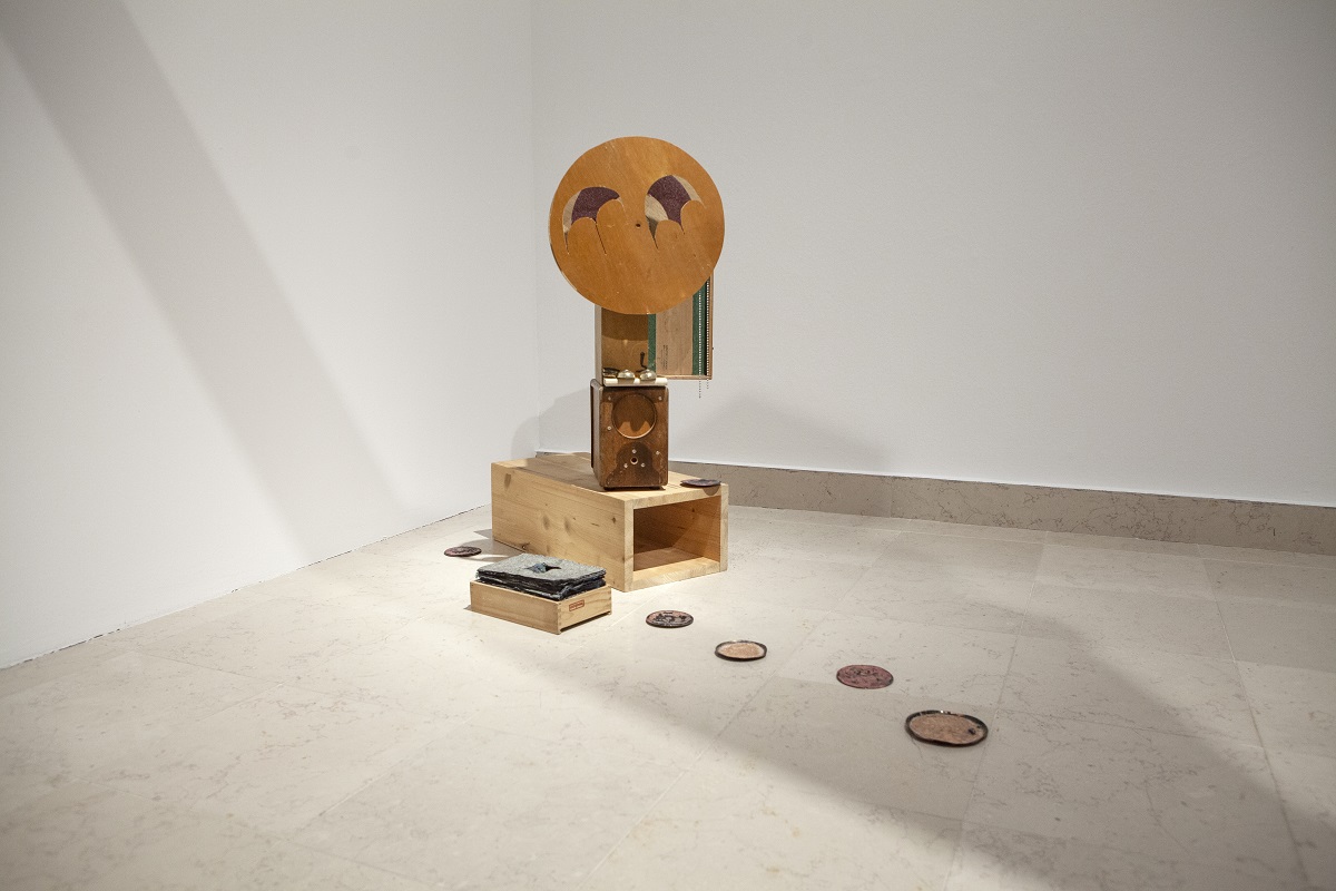 Cavaliere, a sua volta, presenta una ricerca più improntata all’intreccio linguistico, in cui scrittura, suono, voce, disegno e scultura si compenetrano sfociando in un’opera unica e dalla dimensione ambientale. Sempre più preponderante è anche l’aspetto performativo della sua pratica che è presente anche in questa mostra. Partiti da percorsi creativi diversi, di cui si fa ampia narrazione al primo piano del museo, i due hanno intessuto un proficuo dialogo che ha visto il loro lavoro incontrarsi su alcuni punti comuni quali il mosaico, il rapporto con la scultura, la deriva della loro ricerca verso esperimenti sonori.