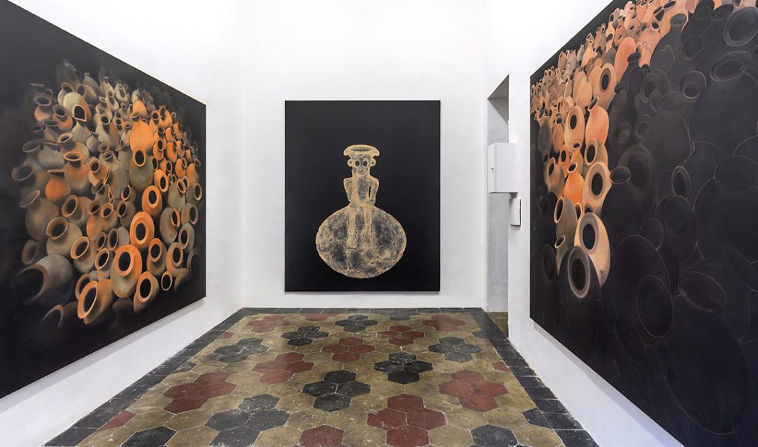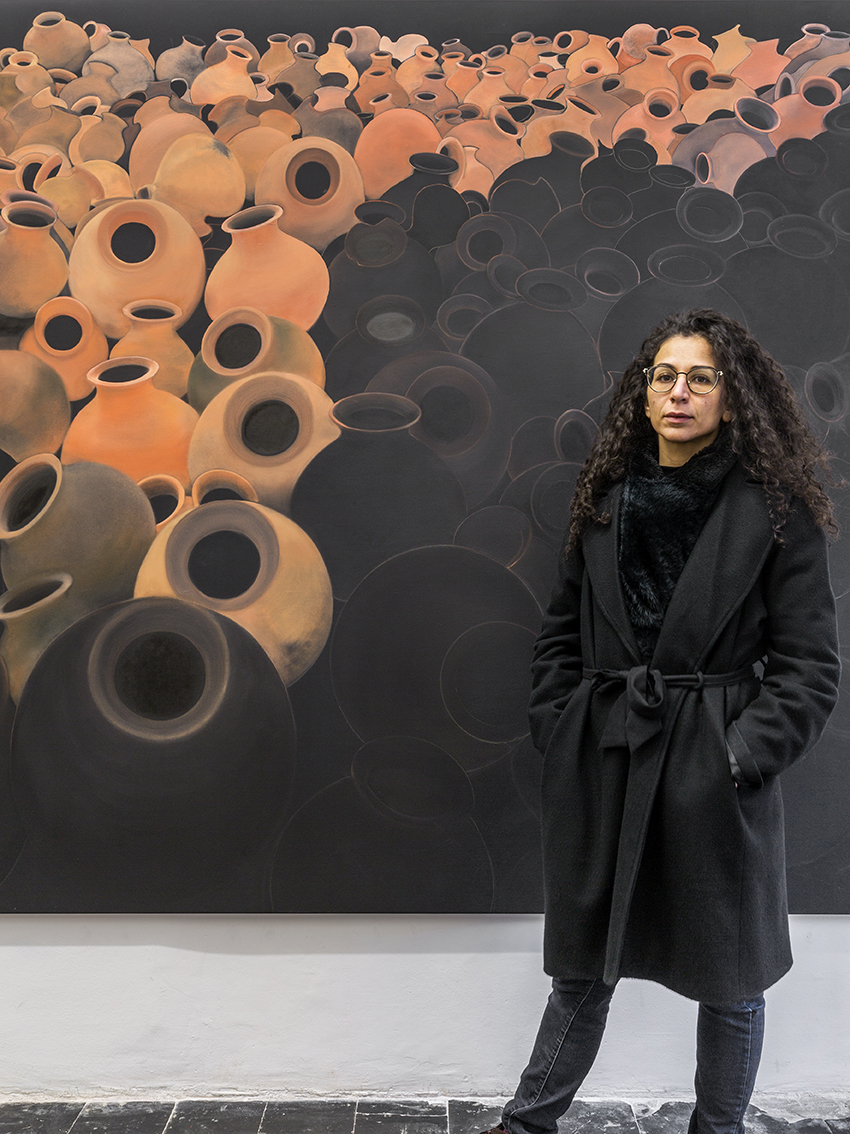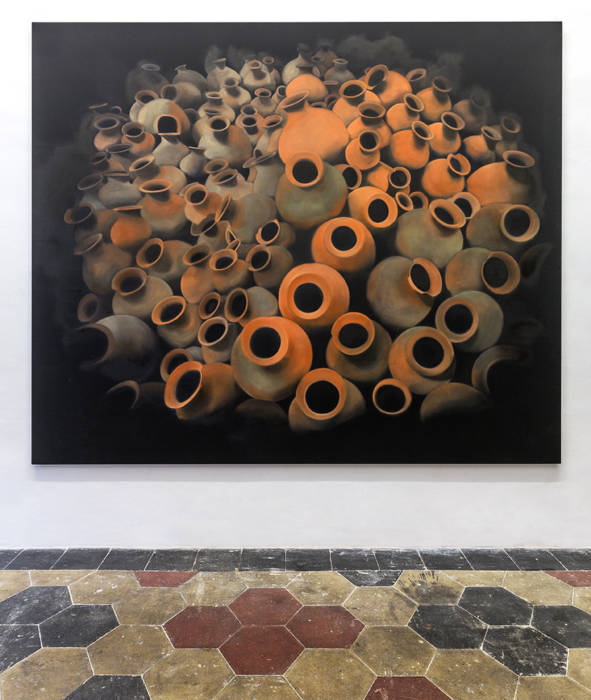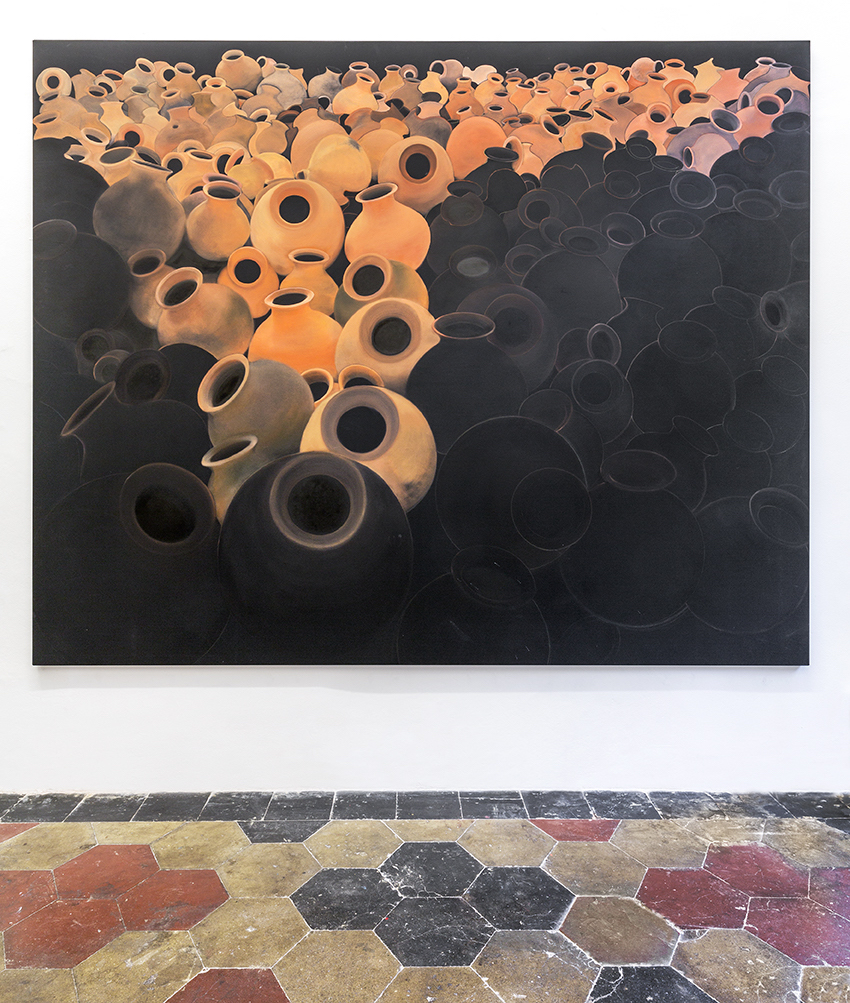 Il colore della superficie crea spazi all’interno dell’oggetto, spazi che a loro volta creano profondità e rimandano a ciò che “si trova nell’oggetto”, proprio come le cose si nascondono nelle parole. Per me l’archeologia non si occupa di oggetti antichi e inanimati, ma si muove nello spazio e spunta/appare sotto forma di contenitore. Esiste nell’anfora o nella sua “immagine”, un movimento che viene astratto dalla materialità. È così che uso l’archeologia, per discostarmene cercando un sapere nascosto, toccando i luoghi del nostro presente di cui non riusciamo a fare esperienza o a cogliere il senso».