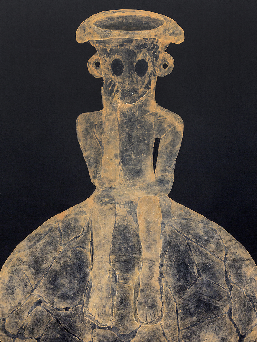 Idol (2020), il dipinto centrale della mostra, trae ispirazione da una statuetta “pensierosa” di 4mila anni fa (l’età del bronzo) posta su un recipiente di terracotta riesumato in Israele/Palestina. La scultura asessuata, ritratta nell’insolito atteggiamento pensoso, è stata rinvenuta nella tomba di un guerriero cananeo. Storicamente i guerrieri venivano sepolti con statuette che fungevano da guide spirituali per l’aldilà e con altri oggetti di terracotta, ad esempio armi e ossa di animali. Turjeman ha realizzato un ingrandimento di quella statuetta che, con gli occhi spalancati e vuoti, tenta di svelare un momento presente mai (ri)visitato prima.