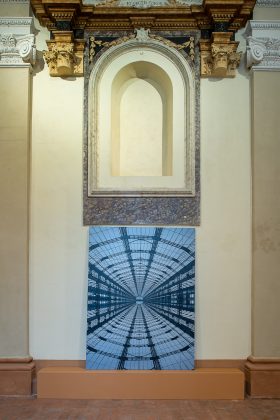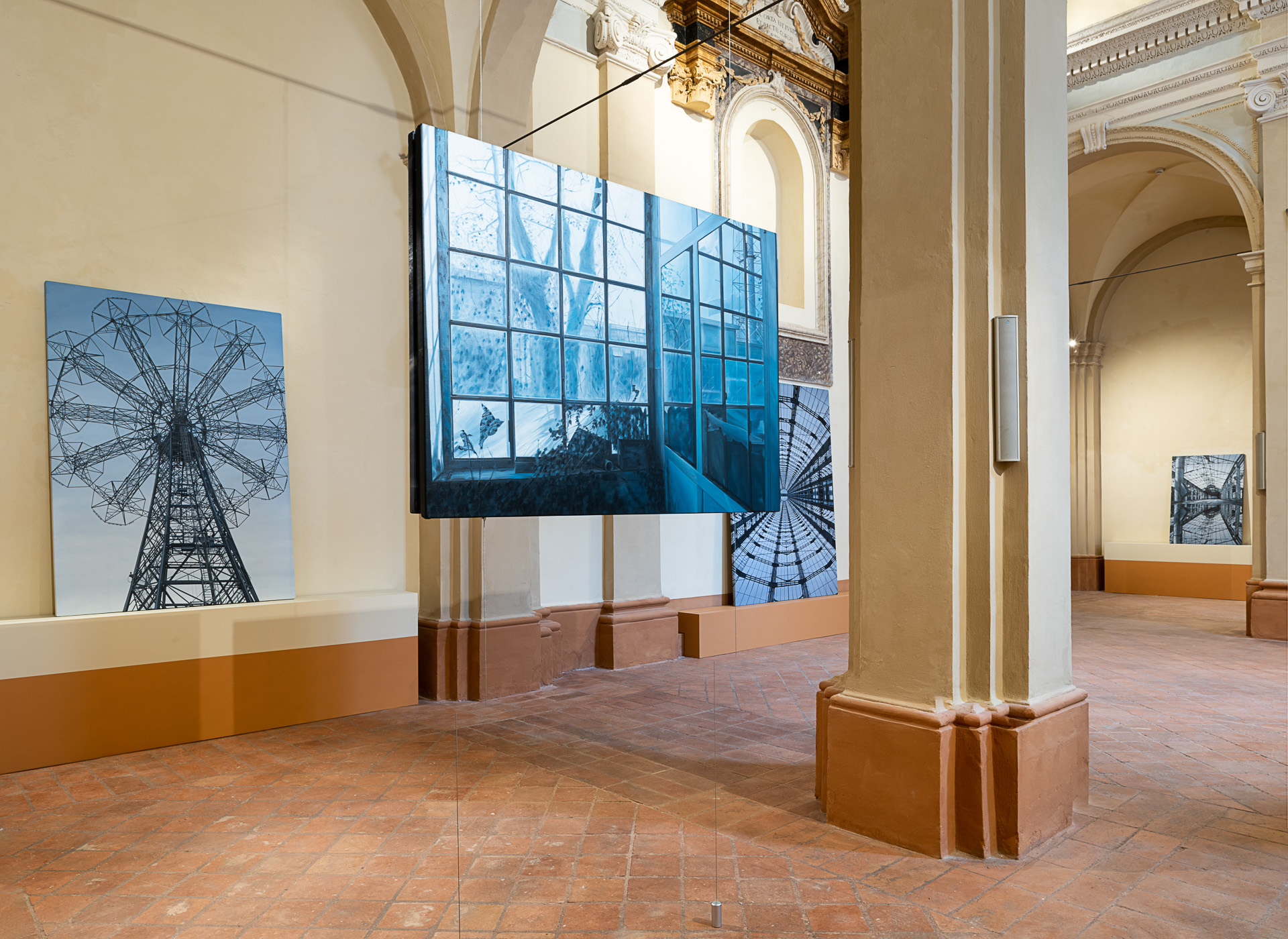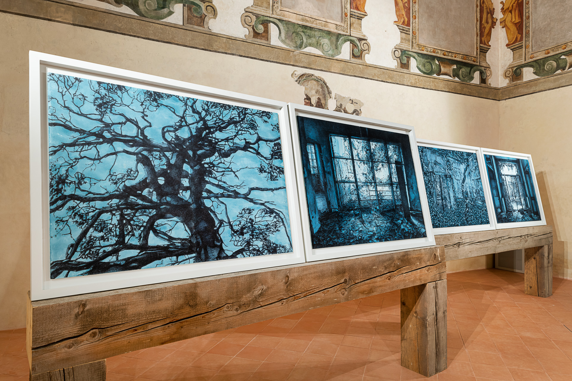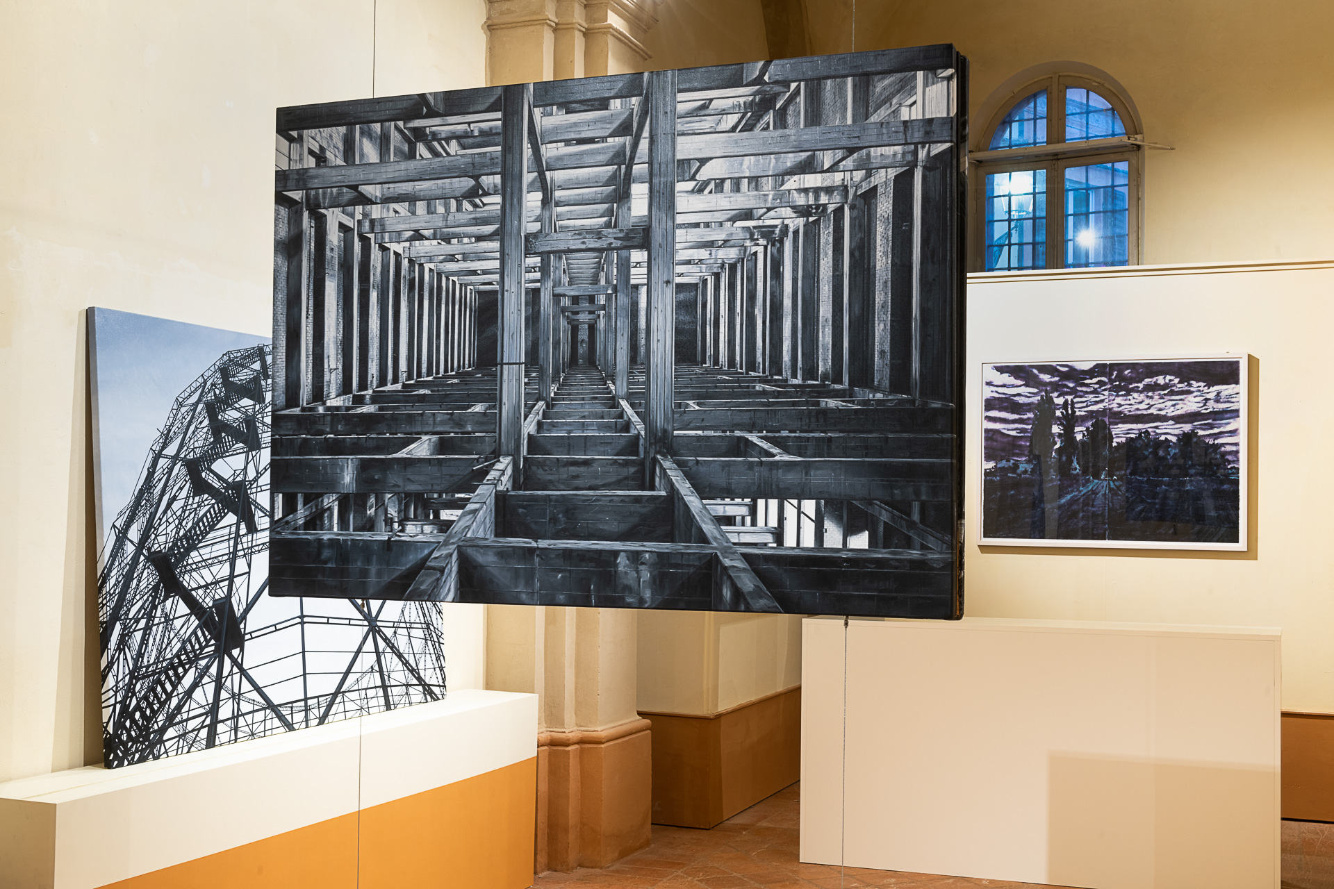 Così, il percorso espositivo pensato da Chiesi e allestito da Saggion-Paganello, sottolinea un’ennesima rinascita, quella degli spazi architettonici, restituiti alla pubblica fruizione per accogliere l’arte. La prima sala presenta dipinti a olio che hanno per soggetto strutture connesse all’archeologia industriale che costellano il territorio italiano: corpi-fabbrica sui quali le categorie di spazio e di tempo hanno esercitato con violenza la propria azione. Nella seconda sala sono esposte opere a inchiostro su carta di grande formato di recente produzione, che raccontano la riappropriazione da parte della natura del proprio ambiente-paesaggio, evidenziando la capacità di sopravvivenza e di rinascita delle specie vegetali anche in condizioni di forte antropizzazione. Nello stesso ambiente, è esposta anche una serie di disegni su carta e taccuini disposti all’interno di tavoli di vetro, nei quali Chiesi costruisce un’affascinante narrazione in progress di Modena, città dove lo stesso artista è nato, nel 1966.