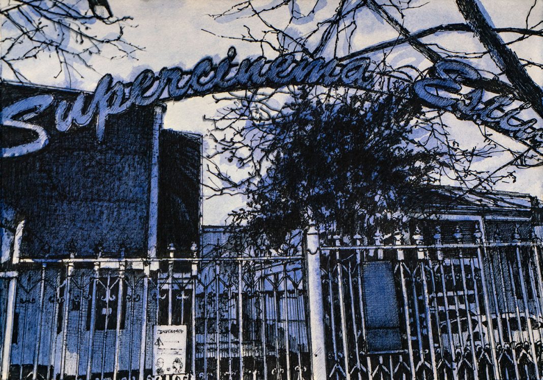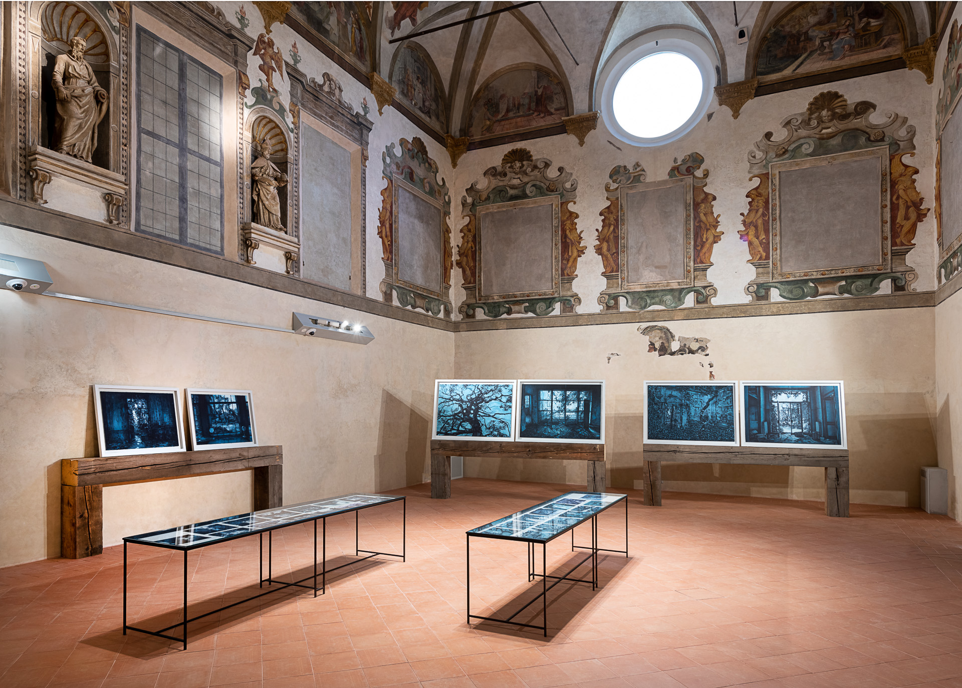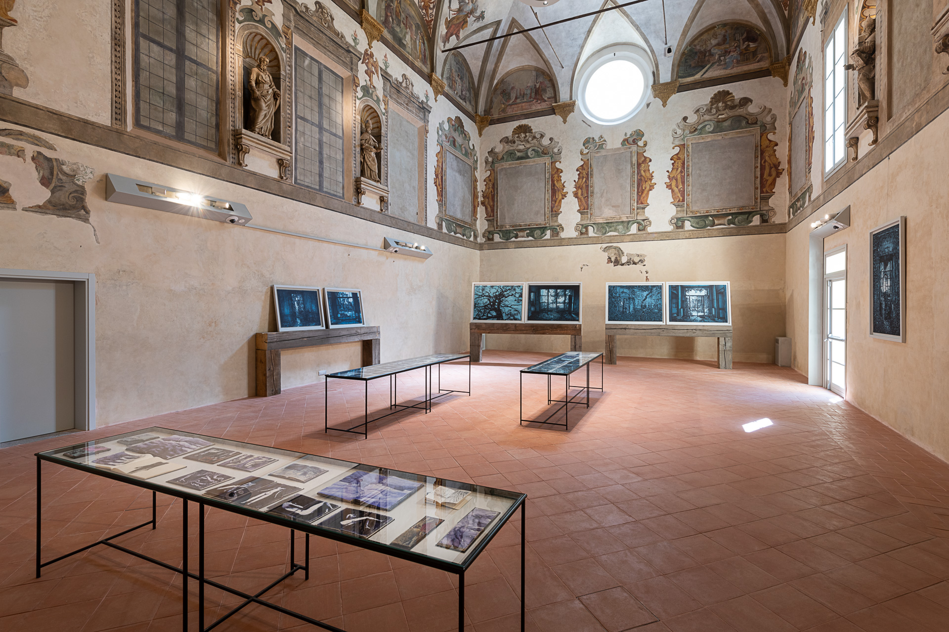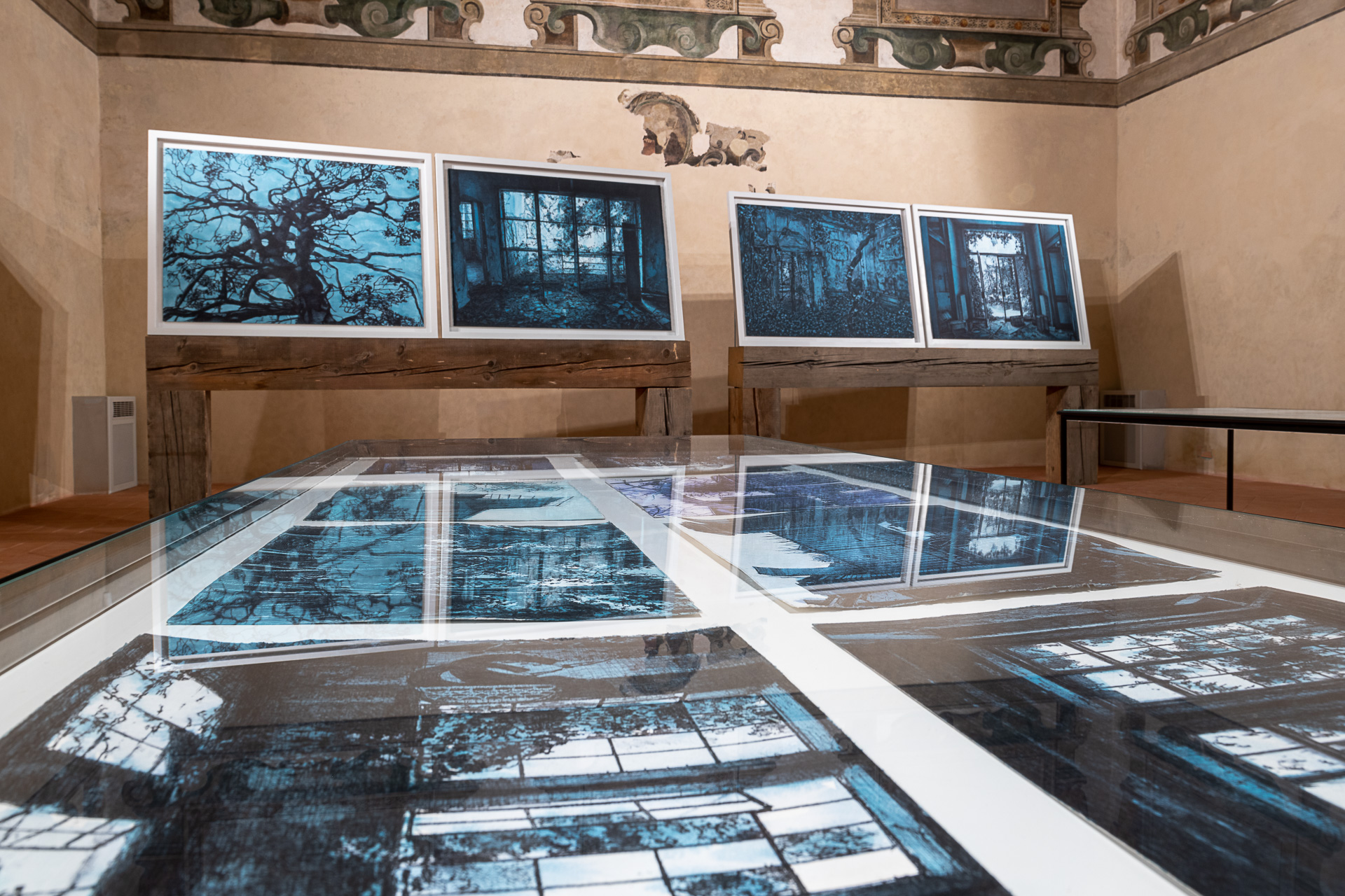 Così, il percorso espositivo pensato da Chiesi e allestito da Saggion-Paganello, sottolinea un’ennesima rinascita, quella degli spazi architettonici, restituiti alla pubblica fruizione per accogliere l’arte. La prima sala presenta dipinti a olio che hanno per soggetto strutture connesse all’archeologia industriale che costellano il territorio italiano: corpi-fabbrica sui quali le categorie di spazio e di tempo hanno esercitato con violenza la propria azione. Nella seconda sala sono esposte opere a inchiostro su carta di grande formato di recente produzione, che raccontano la riappropriazione da parte della natura del proprio ambiente-paesaggio, evidenziando la capacità di sopravvivenza e di rinascita delle specie vegetali anche in condizioni di forte antropizzazione. Nello stesso ambiente, è esposta anche una serie di disegni su carta e taccuini disposti all’interno di tavoli di vetro, nei quali Chiesi costruisce un’affascinante narrazione in progress di Modena, città dove lo stesso artista è nato, nel 1966.