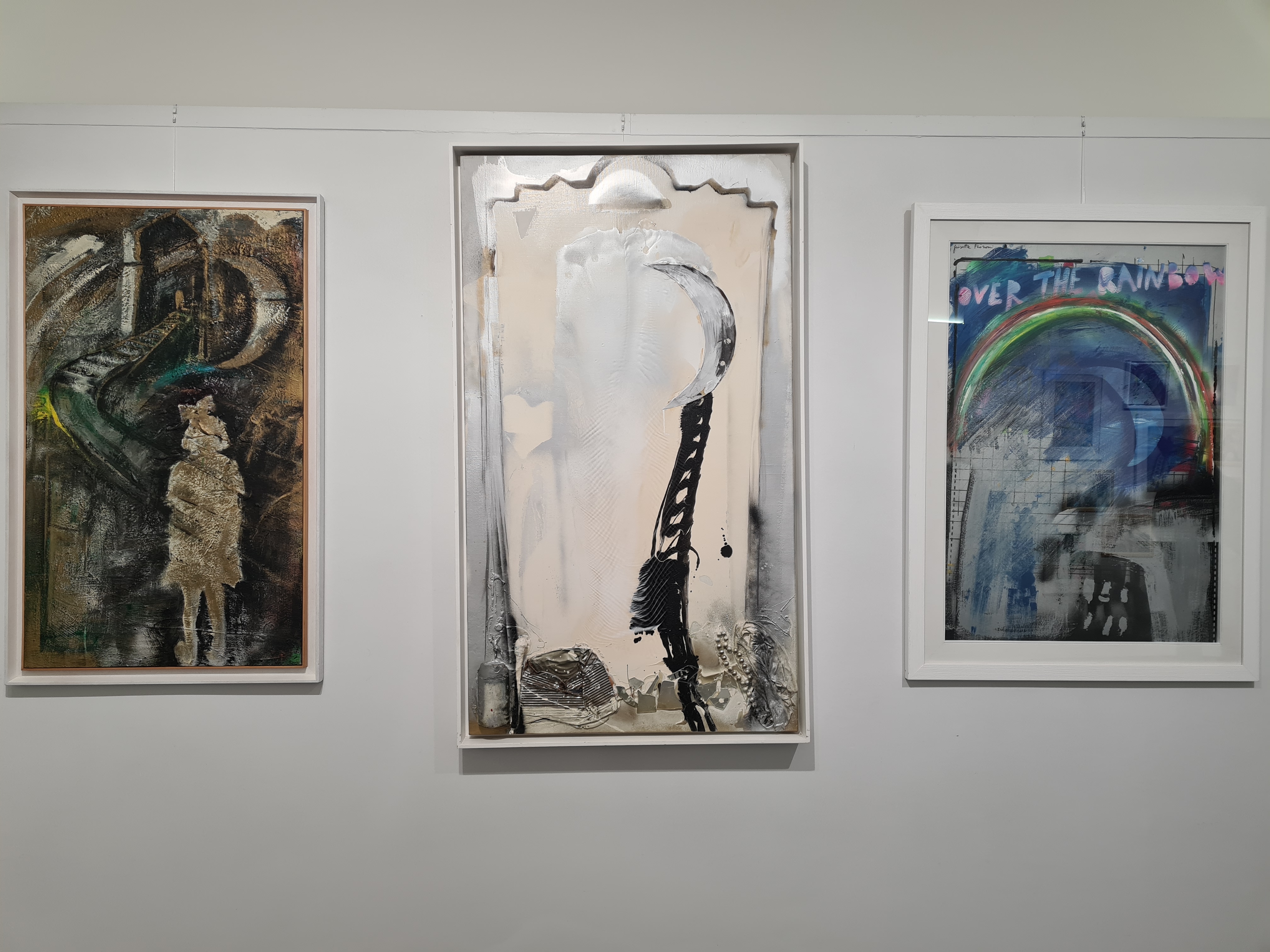 Esposti per “pareti tematiche”, si possono così ammirare la serie dei Volti (declinati anche in corallo, in giallorosso e in oro, alcuni inscritti in un cuore, e che traducono la visione dell’artista dell’universo femminile, della femminilità e del ruolo della donna), delle Lune e dei Cuori, proposte attraverso una ripetitività e serialità, le stesse caratteristiche che sono alla base della pubblicità ma anche dalla ripetitività delle immagini offerta dalle stesse strade della città, filtrate dalla visione e dal vissuto dell’artista. Quel vissuto che si rintraccia anche in quei lavori che, per tecnica, colori e dimensioni, si distaccano dagli altri, come Over the rainbow (2005 – a memoria di un arcobaleno dopo uno dei noti temporali romani), Lente amnesie (2008) e Ritratto di bambina (2003), ovvero la stessa Giosetta Fioroni bambina ma, al contempo, un delicato richiamo a quell’animo infantile ancora racchiuso in lei.