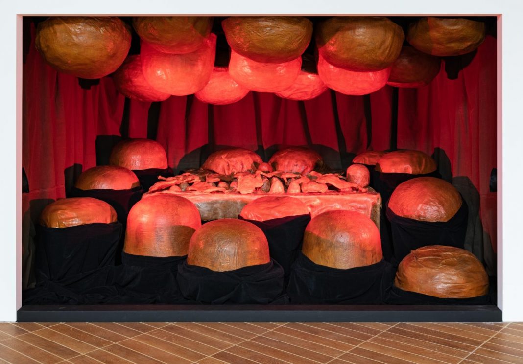 Jenny Holzer parla dei diari di Louise Bourgeois e di quello che ci ha trovato dentro. Si è inventata un’app immersiva per girare nella Destruction of the Father, opera fondamentale del 1974 della scultrice, – la chiamiamo scultrice Bourgeois? riproposta al Kunstmuseum, una specie di ultima cena fatta di prepuzi intorno a un tavolo su cui è steso un corpo decomposto, teste o cappelle ribaltate anche sul soffitto, le tende vellutate tutto intorno, la luce rossa, atmosfera decisamente asfissiante. La puzza arriva fin qui.
