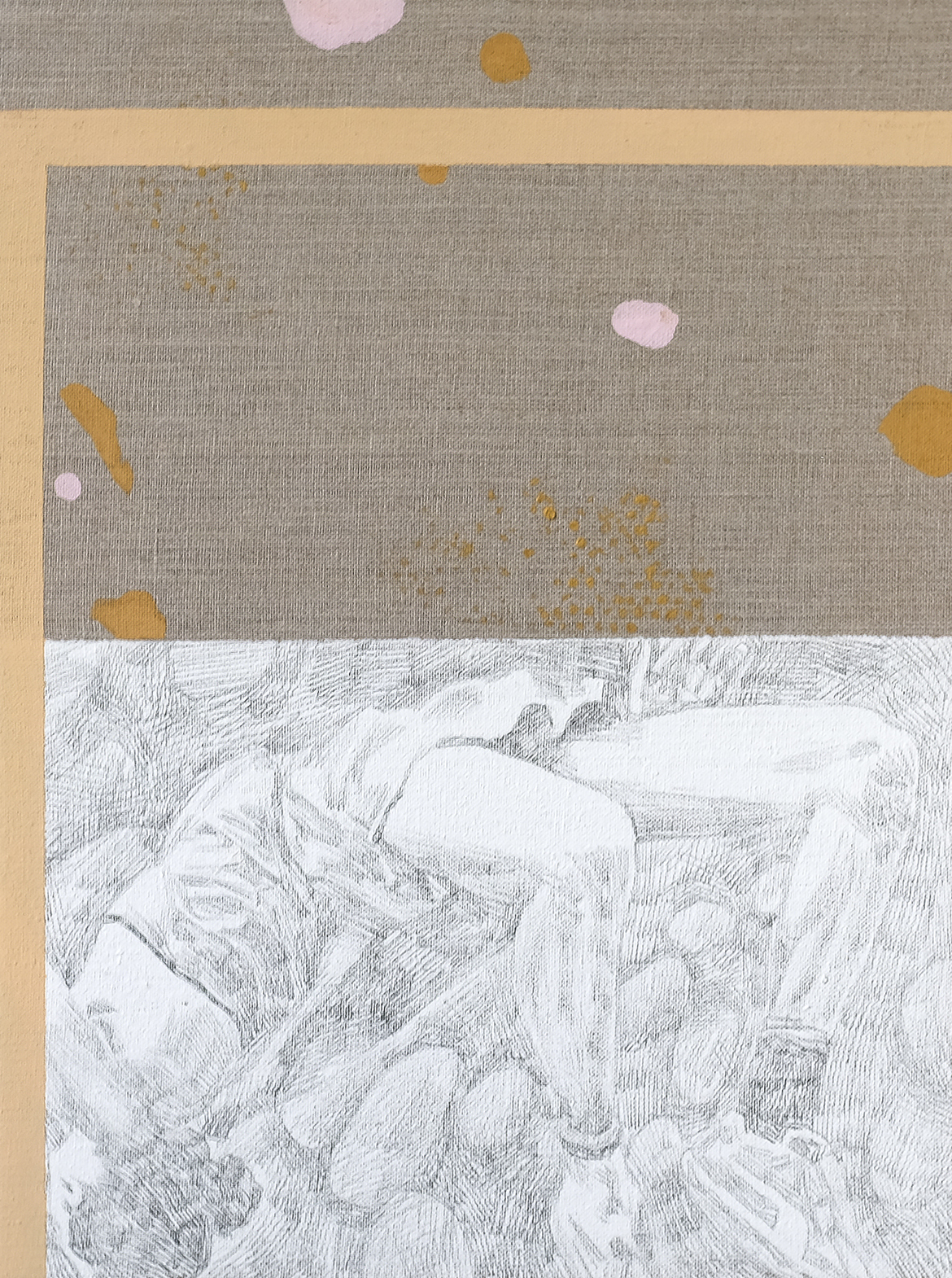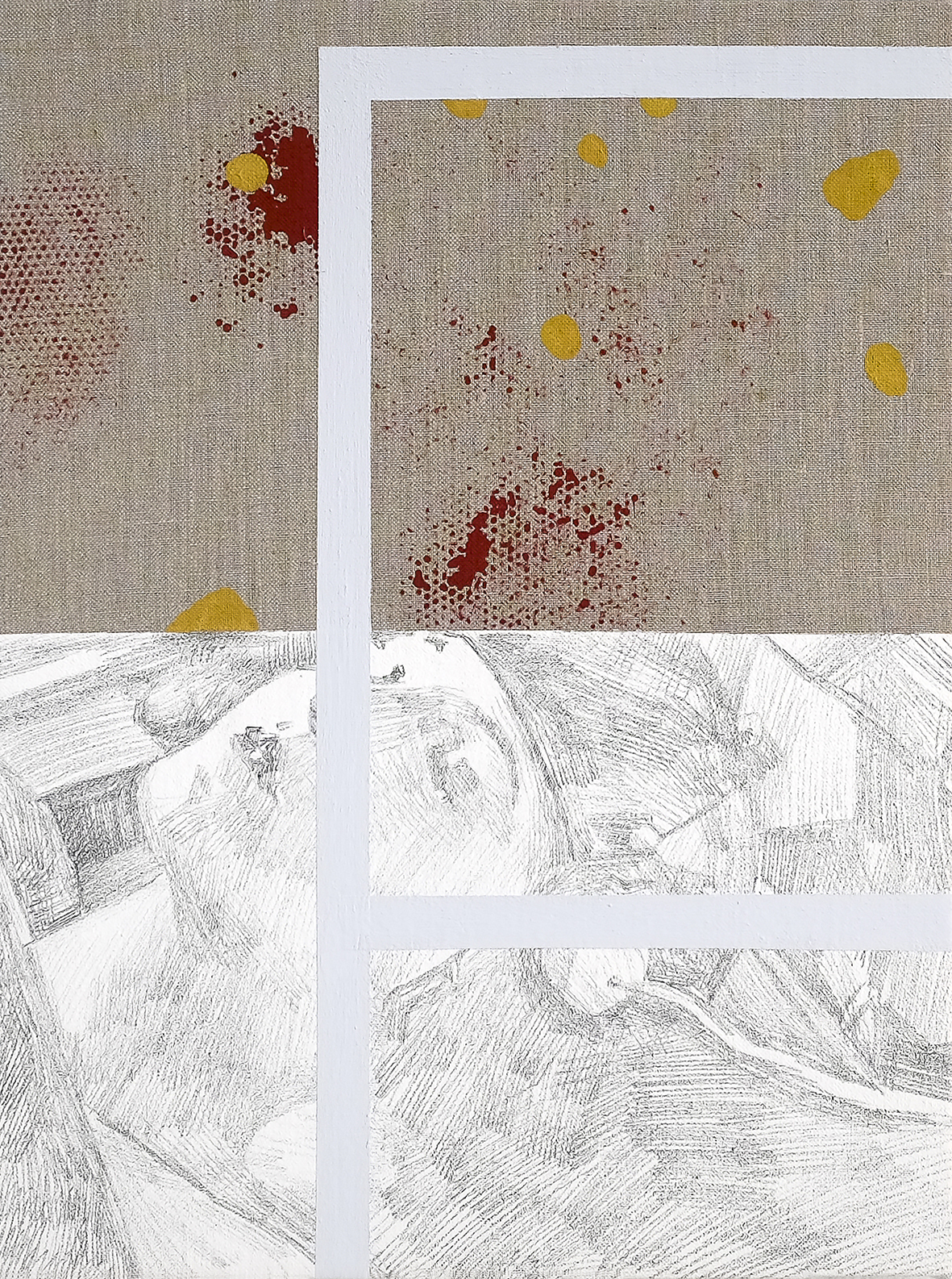 Coser, nato a Trento nel 1965 e docente di disegno all’Accademia di Brera, assume questa predisposizione mentale nella sua pratica pittorica. Le sue opere si dispongono come frammenti di un discorso che si costruisce nell’osservazione: segni a matita emergono da velature quasi evanescenti, figure affiorano tra macchie di colore, mentre rimandi letterari si intrecciano con la gestualità della pittura. L’artista non racconta, non dichiara ma suggerisce, non afferma, lascia spazio alla scoperta.