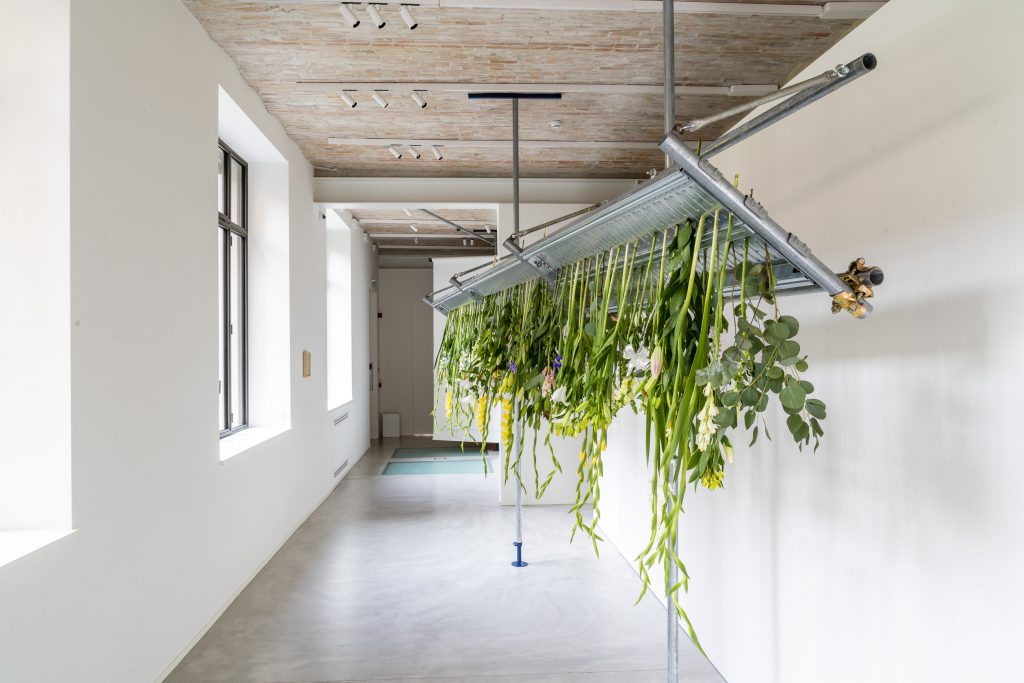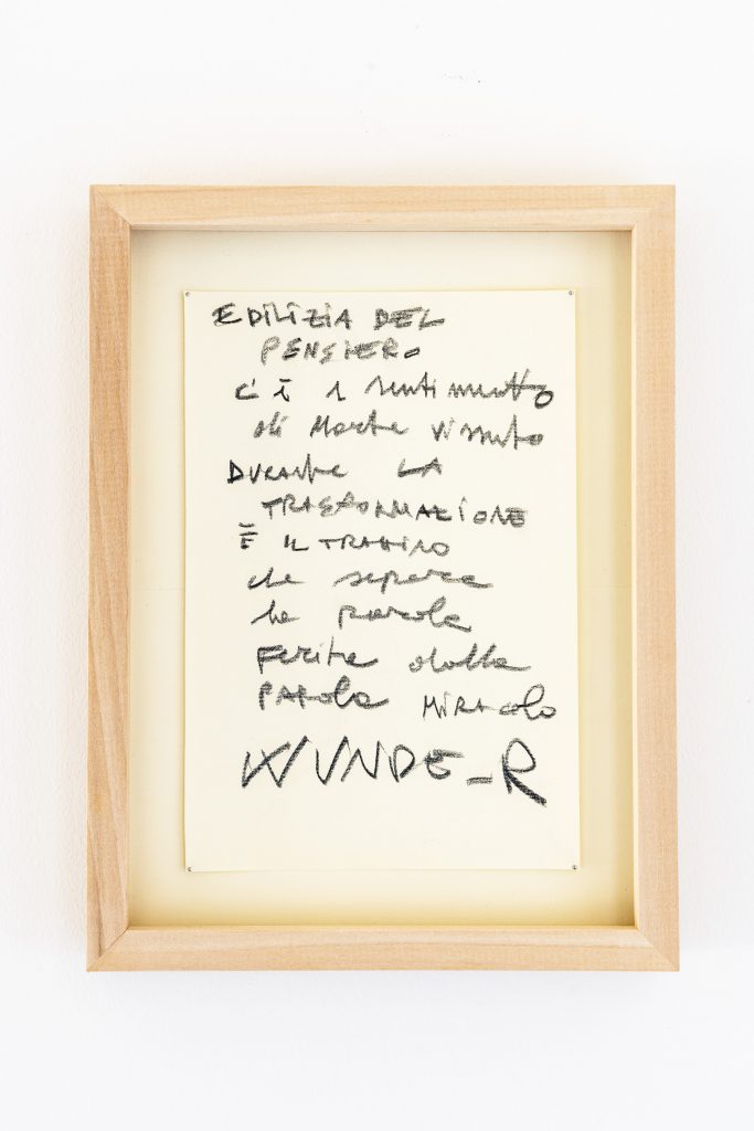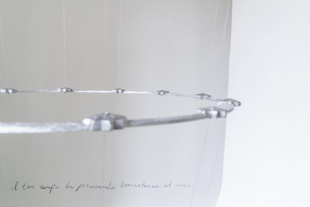 Sono elementi in forte contrasto tra loro, che con il loro dialogo restituiscono un’idea di fragilità. Le mantovane parasassi, concepite tradizionalmente per creare un ambiente di sicurezza e arginare il materiale edilizio in caduta all’interno di un cantiere, accolgono infatti fiori freschi, destinati, nel mentre della mostra, ad appassire, a cadere, a essere sostituiti per avviare un nuovo ciclo, che continuamente trasformerà la mostra in un’incessante lavoro di creazione che corrisponde alla nostra stessa vita. «C’è 1 sentimento di morte vissuto durante la trasformazione è il trattino che separa la parola ferita dalla parola miracolo WUNDE_R» scrive in una nota incorniciata Lucia Cantò a proposito di Edilizia del pensiero sospendendola a pochi passi da Stellario.