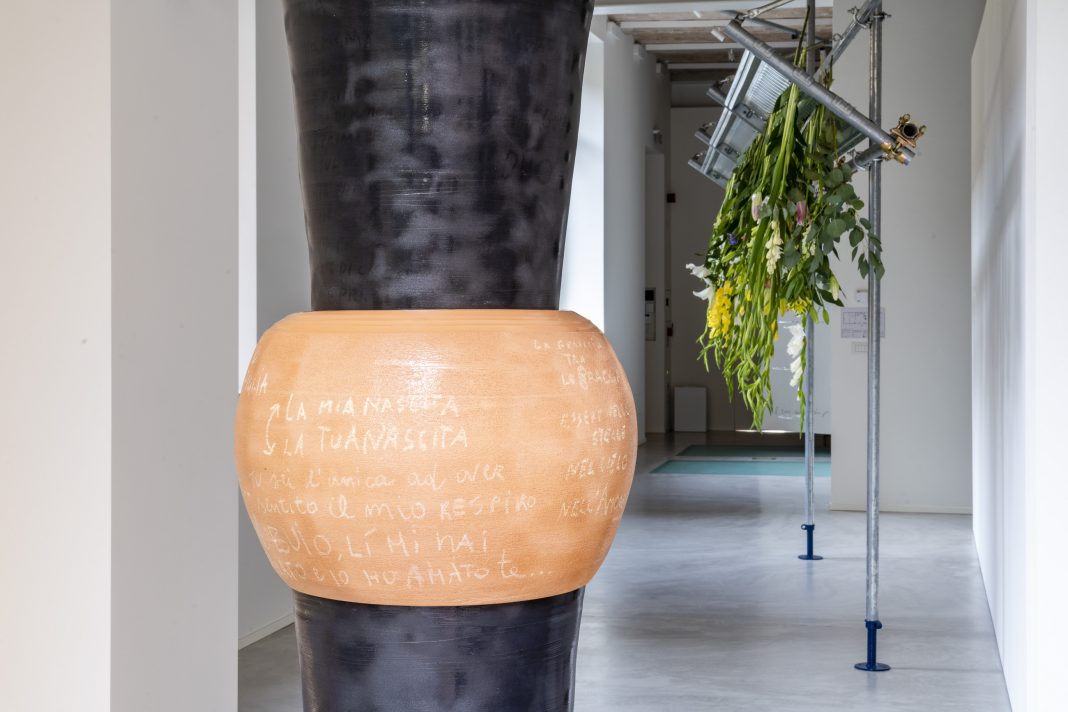 L’impianto circolare del percorso espositivo fa in qualche modo risuonare quel verso di Ada Merini in cui si scriveva «Nel cerchio di un pensiero mi riposo sognando»: come la poetessa, così anche Lucia ha una straordinaria, e sensibile, capacità di esporsi, facendosi vedere fragile. Si inizia e si finisce a contatto con la terracotta: in principio è Madre, un vaso di grandi dimensioni, composto da tre elementi assemblati in un unico equilibrio. Auto-rappresentazione e contenitore ideale di un’anima, di uno spirito, di un corpo – fin dall’antichità legato al potere trasformativo e riproduttivo della donna – Madre materializza un pensiero che nasce dalla raccolta di voci femminili, e traccia un serrato, intimo ed emotivo, dialogo tra Lucia Cantò e, appunto, sua madre: «La mia nascita. La tua nascita», «Tu sei l’unica ad aver sentito il mio respiro».