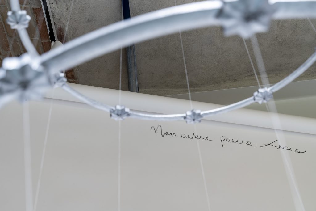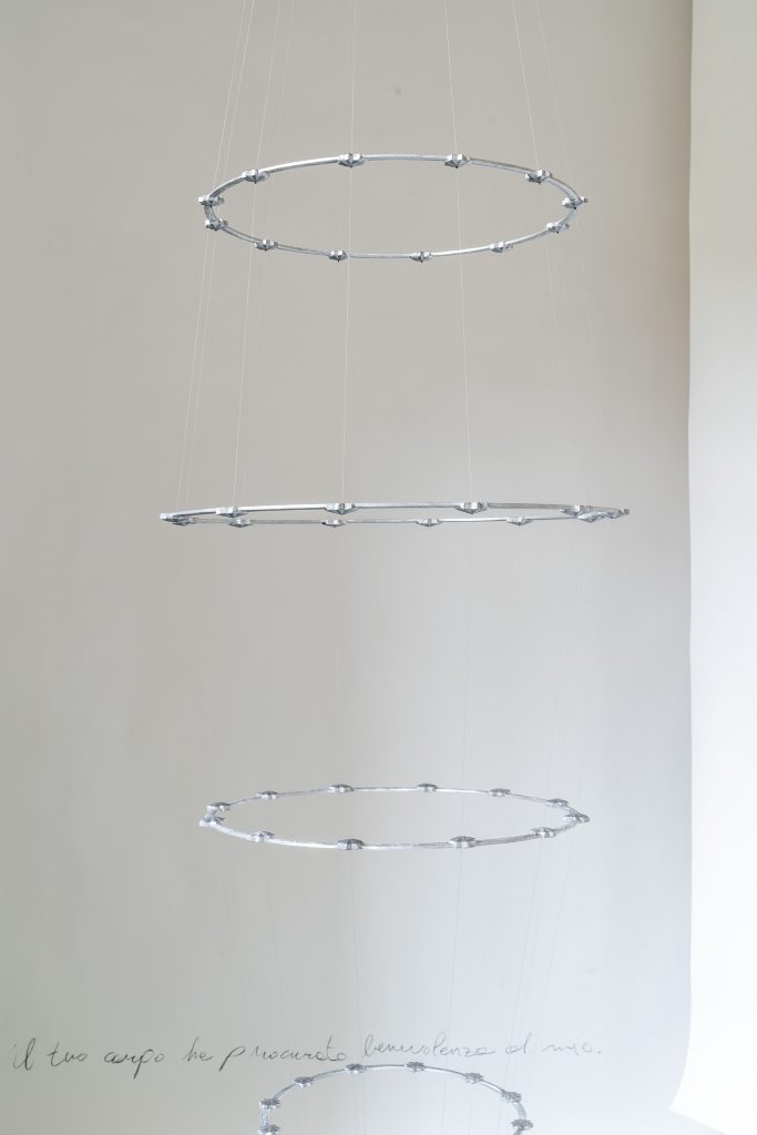 Stelle che sorreggono altre stelle, non è solo il titolo della mostra e ciò che l’occhio vede e il cuore sente di fronte all’ultima installazione, sul retro della quale ritroviamo, appunto, quel «Non avere paura Lucia». In una chiesa, durante un soggiorno a Napoli, una corona in bronzo corredata da dodici stelle ha ispirato Lucia Cantò che, per la Fondazione Elpis, ha scelto di replicare, in dimensioni differenti, sospendendo ognuno dei sette moduli dall’alto e gli uni con gli altri con dei fili di cotone. Non esiste gerarchia alcuna, solo un movimento ascensionale, verso il cielo, ispirato dalla fede di potersi sostenere e salvare a vicenda.