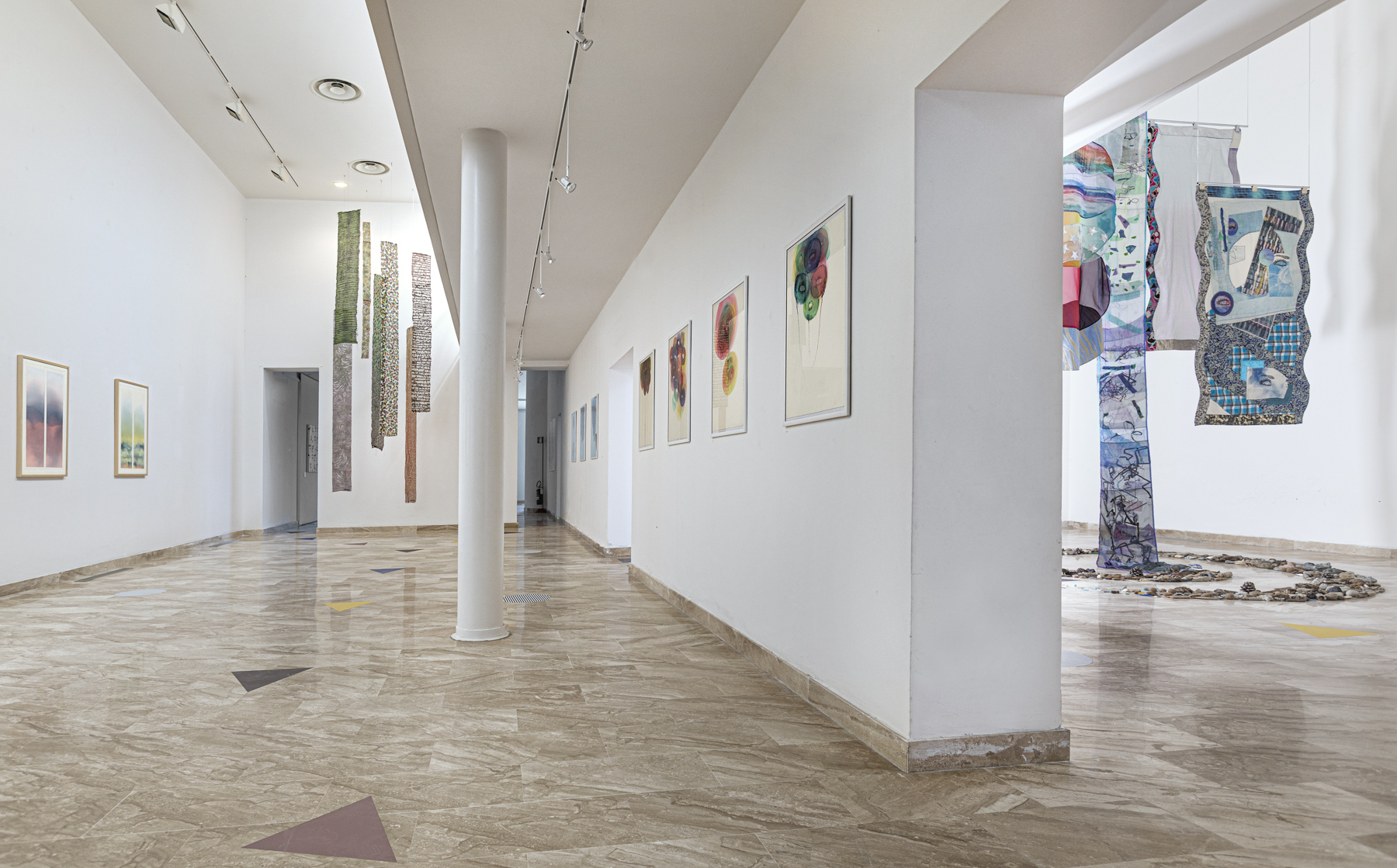 Se i primi sono una parte dei risultati dell’attività di Lalla Lussu lungo gli anni del suo operato da poco interrottosi, parte delle opere della seconda sono figlie dello scambio immaginario tra le due, sviluppato da Ludovica Gioscia. Elemento centrale è Ramadura Marina, installazione mixed media creata per il MACC, ricordo dell’usanza votiva sarda delle essenze floreali e insieme omaggio dedicato a Lalla Lussu, composta da drappi e teli sospesi che dall’alto fluiscono e si connettono, muovendosi come onde, alla grande