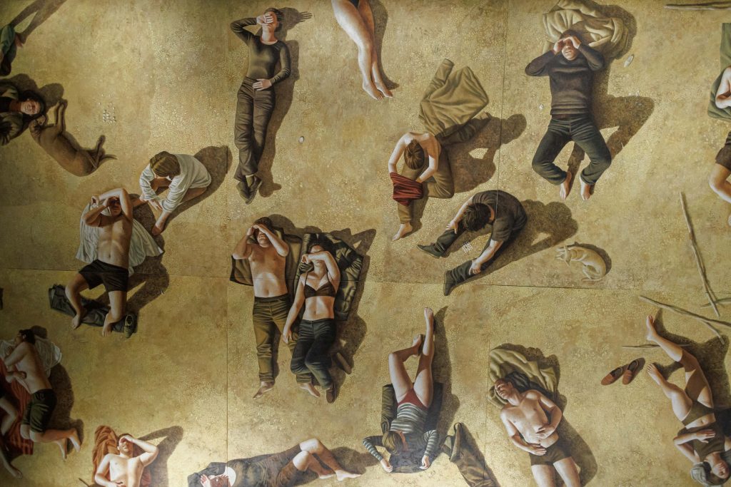 Sdraiati sotto un sole che sembra impossibile da sopportare, i giovani corpi delle tele di Vittorio Marella raccontano più di quanto il semplice sguardo potrebbe percepire. Nella sua nuova mostra, a cura di Denis Isaia e Giovanna Zabotti, fino al 22 marzo, il pittore veneziano trasforma la luce in protagonista assoluta: fonte di calore, strumento di tensione e di riflessione ecologica. Le opere più piccole, quasi dei close-up cinematografici, mostrano volti coperti dalle mani, come a proteggersi dai raggi troppo intensi. Questi dettagli anticipano i grandi teleri che dominano la sala successiva: ragazzi e ragazze sdraiati sotto un sole cocente, in un tempo incerto e senza punti di riferimento precisi. Nessuna montagna, nessuno specchio d’acqua, nessun segnale stagionale.