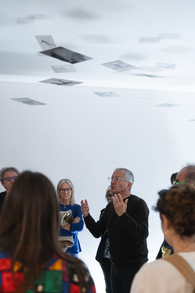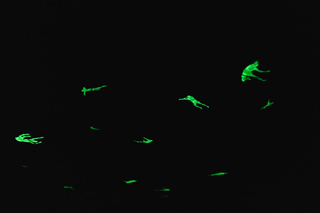 Come un risveglio, appunto: chi legge le sue opere nei significati più profondi acquisisce uno sguardo diverso sul presente, più ampio, più fiero… un’orbita nuova. In questo senso, Morbin incarna quell’idea hegeliana di artista come colui che ci fa vedere meglio ciò che già abitiamo: rende visibile l’invisibile, portando alla superficie tensioni, scenari e possibilità che altrimenti resterebbero celati. «È un invito a disallinearsi. A sottrarsi alle geometrie del controllo, per esplorare forme alternative di esistenza, pensiero e relazione», racconta il curatore e direttore artistico di Habitat83 Zeno Massignan. Attraverso performance, sculture e fotografie, l’artista invita a rivalutare e ad aprire gli occhi su dinamiche di potere e controllo mascherate, per esempio, da servizi per il pubblico nel campo delle telecomunicazioni. È il caso delle due opere L.E.O. (Low Earth Orbit), installazioni in cui immagini di saltatori con l’asta, colti nell’attimo esatto in cui superano l’ostacolo, sono sospese in aria, in modo da orbitare sopra le teste dei visitatori. Al buio, i corpi degli atleti diventano fosforescenti, come satelliti che ci passano accanto a poca distanza. «È un’operazione drammatica e affascinante al tempo stesso: la deambulazione dei satelliti sopra di noi» racconta l’artista. «Dal punto di vista tecnologico è super efficiente, permette connessioni potentissime. D’altro canto, è un potere enorme nelle mani di una sola persona: Elon Musk. Oggi questi satelliti servono per la trasmissione di dati, ma sempre più anche di immagini. È un fascino, e un pericolo, allo stesso tempo».