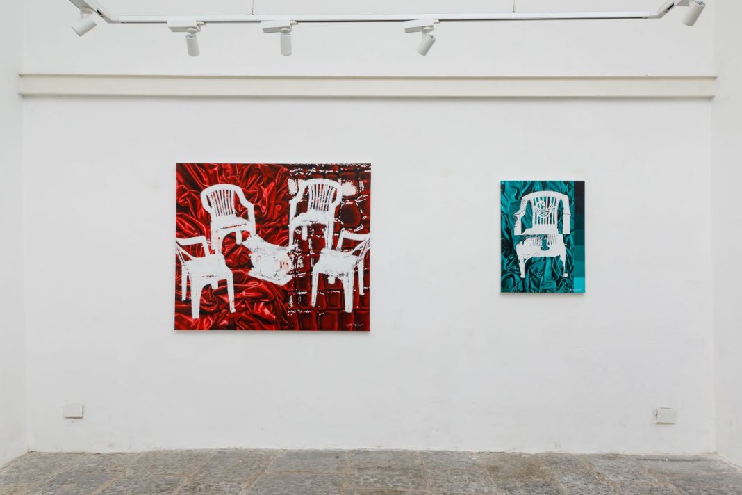 La sedia quindi assurge ad archetipo allegorico tramite il quale l’artista ci invita a indagare l’uomo e il mondo che lo circonda. La novità apportata per questo nuovo progetto, che ha avuto una gestazione di due anni ed è stato realizzato ad hoc per gli spazi di via Pasquale Scura, risiede nell’affrancarsi dalla figura umana, ponendo al centro della produzione esclusivamente la sedia come elemento concettuale, a rappresentare un momento essenziale: con quell’oggetto, la casa inizia a prendere vita. L’umanità in questo caso non viene più rappresentata direttamente, come nei suoi precedenti dipinti, ma viene narrata tramite la collocazione e la quantità delle sedie. La singolarità delle opere viene rafforzata, sul retro di ogni quadro, dalla presenza di una frase dell’artista o di uno scrittore.