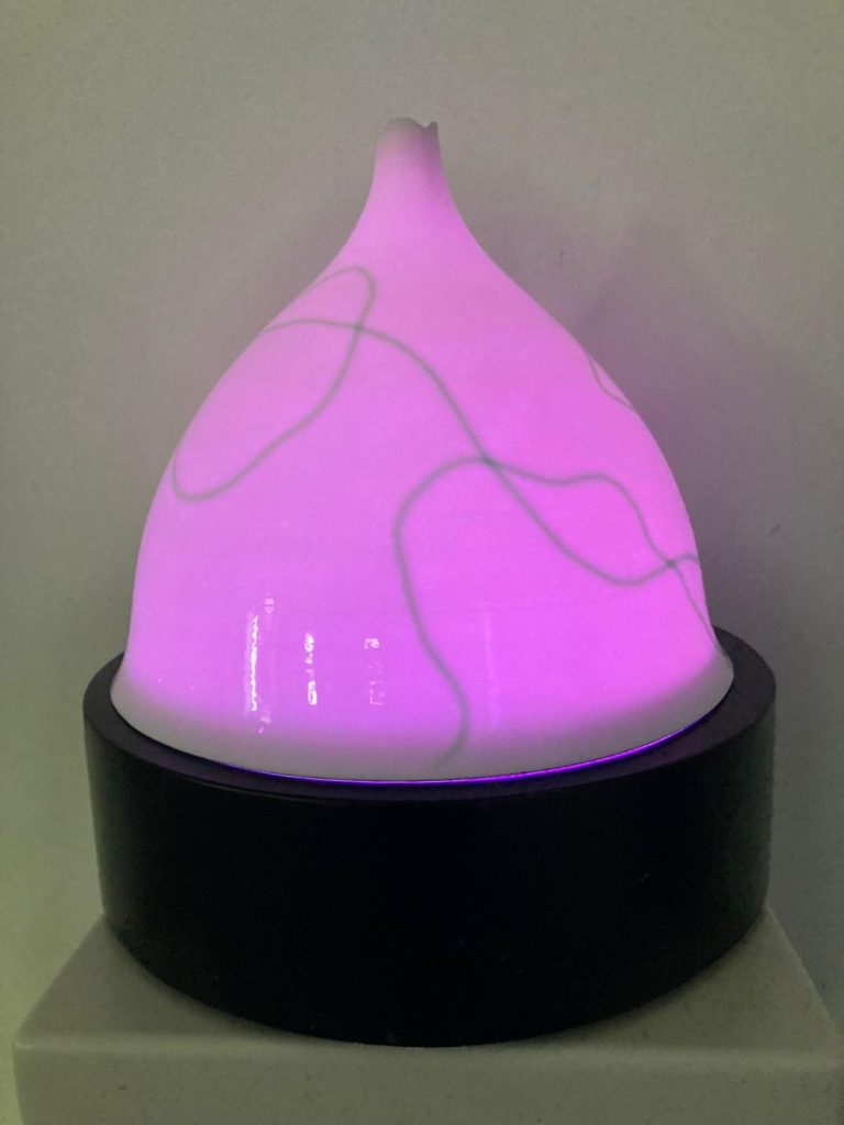 L’artista ci introduce poi alle infinite possibilità offerte da innovativi forni specializzati – come ad esempio quello della NASA che porta avanti esperimenti sulla ceramica – che si cimentano in tecniche quali l’inversione della carica degli elettroni, in modo da proiettare il caldo verso l’interno e permettere che gli estremi si raffreddino immediatamente. Ci saluta mostrandoci la modulazione di un’opera tramite gli alti e bassi di un violino e l’invenzione di un collegamento tra una ceramica posizionata su un basamento di fronte alla vetrata della galleria e l’app che permette di visualizzare, spegnere e accendere l’opera direttamente dal divano di casa propria.