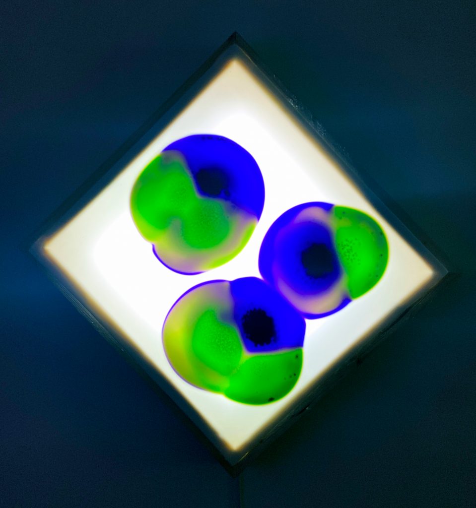 I blocchi sulla parete opposta sono invece la sintesi delle diverse tecniche studiate da Boccini nel corso degli ultimi anni. Partendo dalla tematica dello scioglimento dei ghiacciai, l’artista raccoglie dei cubetti di acqua unita a cobalto e rame prima mescolati e poi congelati. L’amalgama viene quindi tirato fuori in forma di ghiaccio e il risultato è che la porcellana si riassorbe a seconda di come è stata cotta e manipolata. Una tecnica quasi casuale, indiretta, in cui Boccini stesso è spettatore del processo di formazione dei pattern. Un esempio di ceramica organica in cui sfumature di blu, verde e degli altri colori che si materializzano sul supporto danno luogo a venature e giochi di luce accidentali.