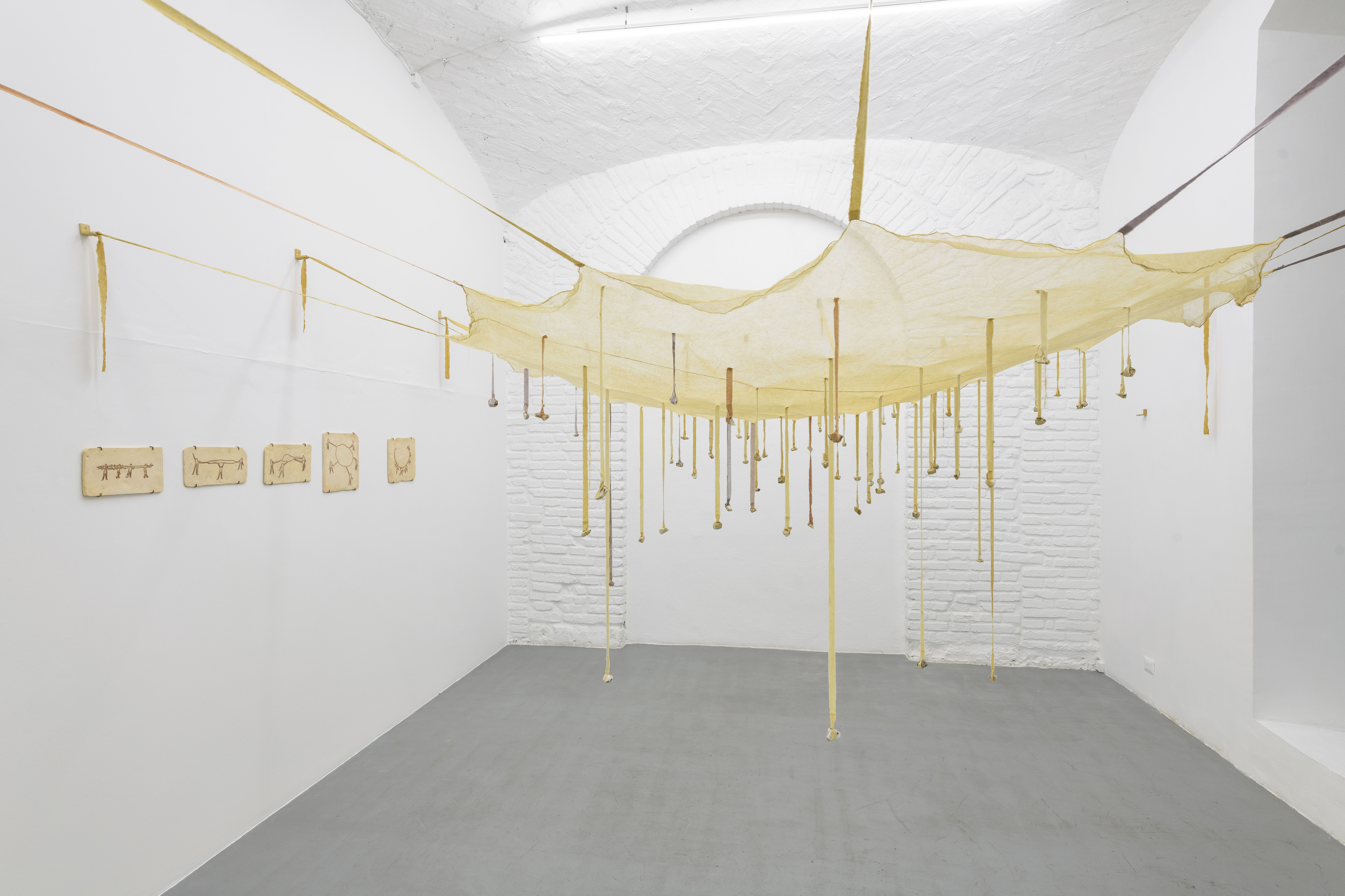 Escher costruisce così un ambiente che ruota attorno al limite della conoscenza misurabile, interrogando la distanza tra fenomeno naturale ed esperienza sensibile. La mostra riunisce una serie di opere concepite appositamente per lo spazio della galleria: una grande installazione di tessuti trattati con pigmenti naturali accoglie il visitatore e introduce un percorso immersivo, mentre sottili lastre di terracotta recanti figurazioni archetipiche si dispongono lungo le pareti, affiancate da una costellazione di sculture che proseguono la ricerca materica dell’artista.