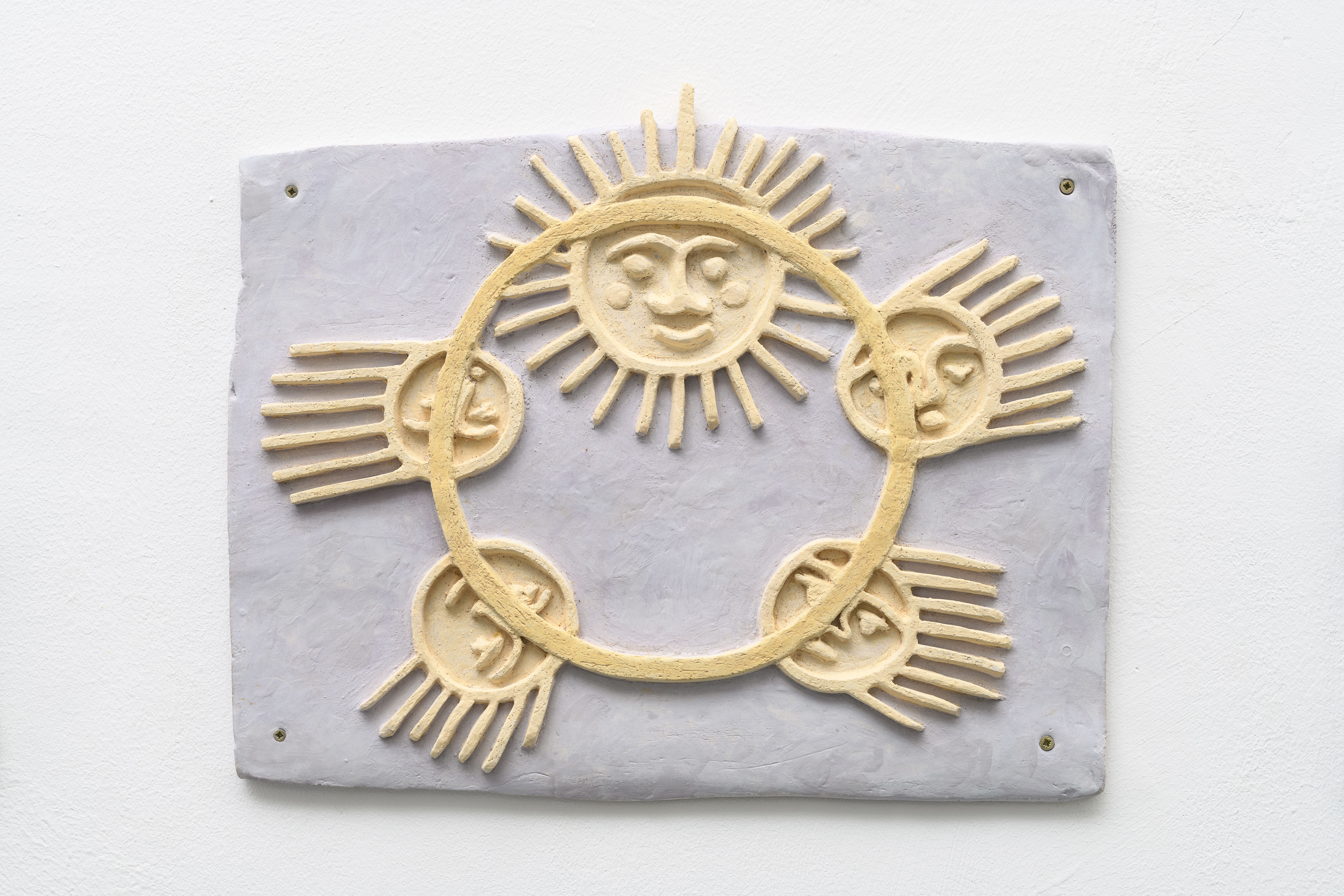 Maja Escher, cinco sóis ou a energia do cabelo – five suns or the energy of the hair, 2026, argilla bianca, ossidi/faience, oxides, 36 x 29 x 1 cm