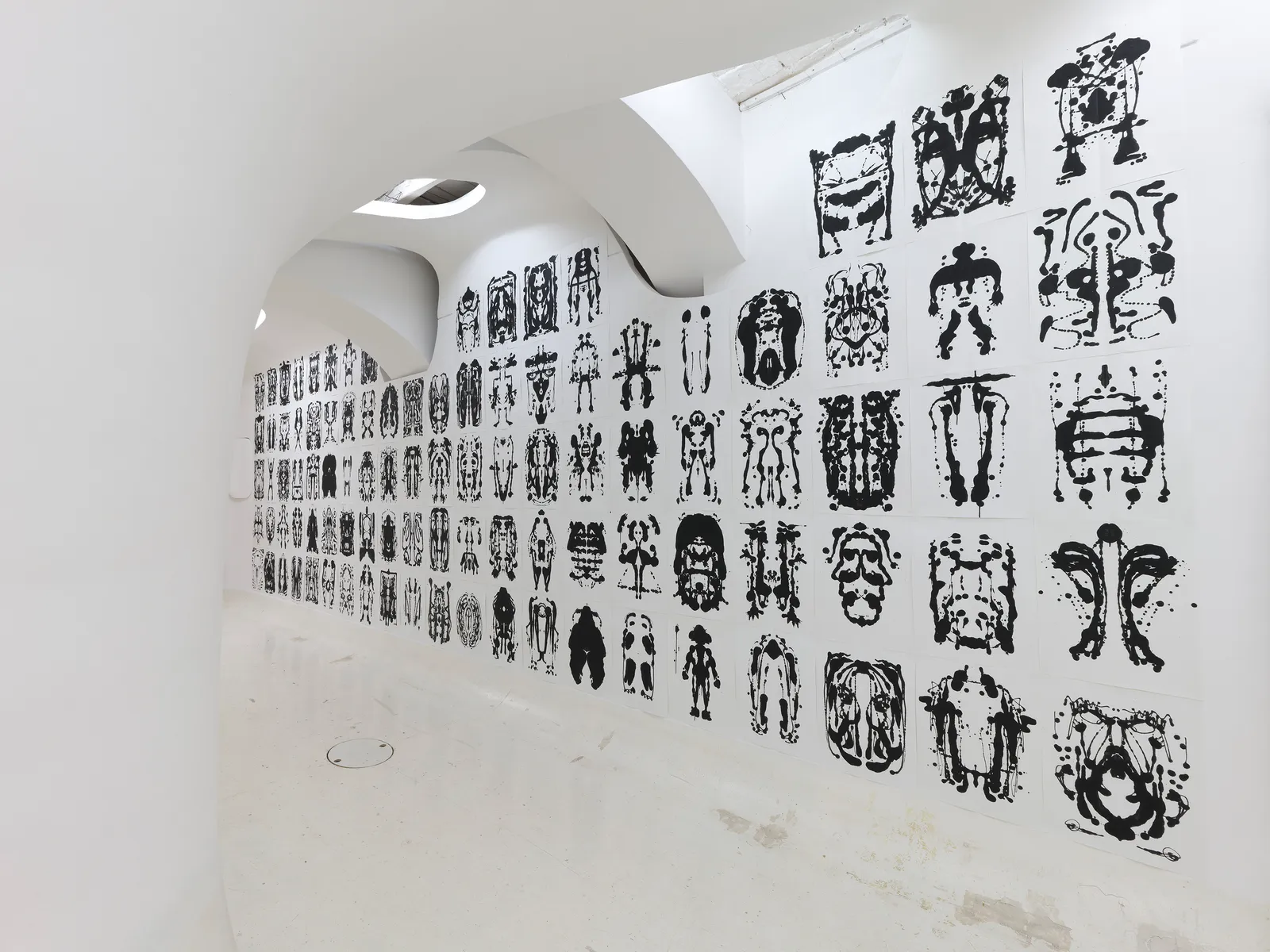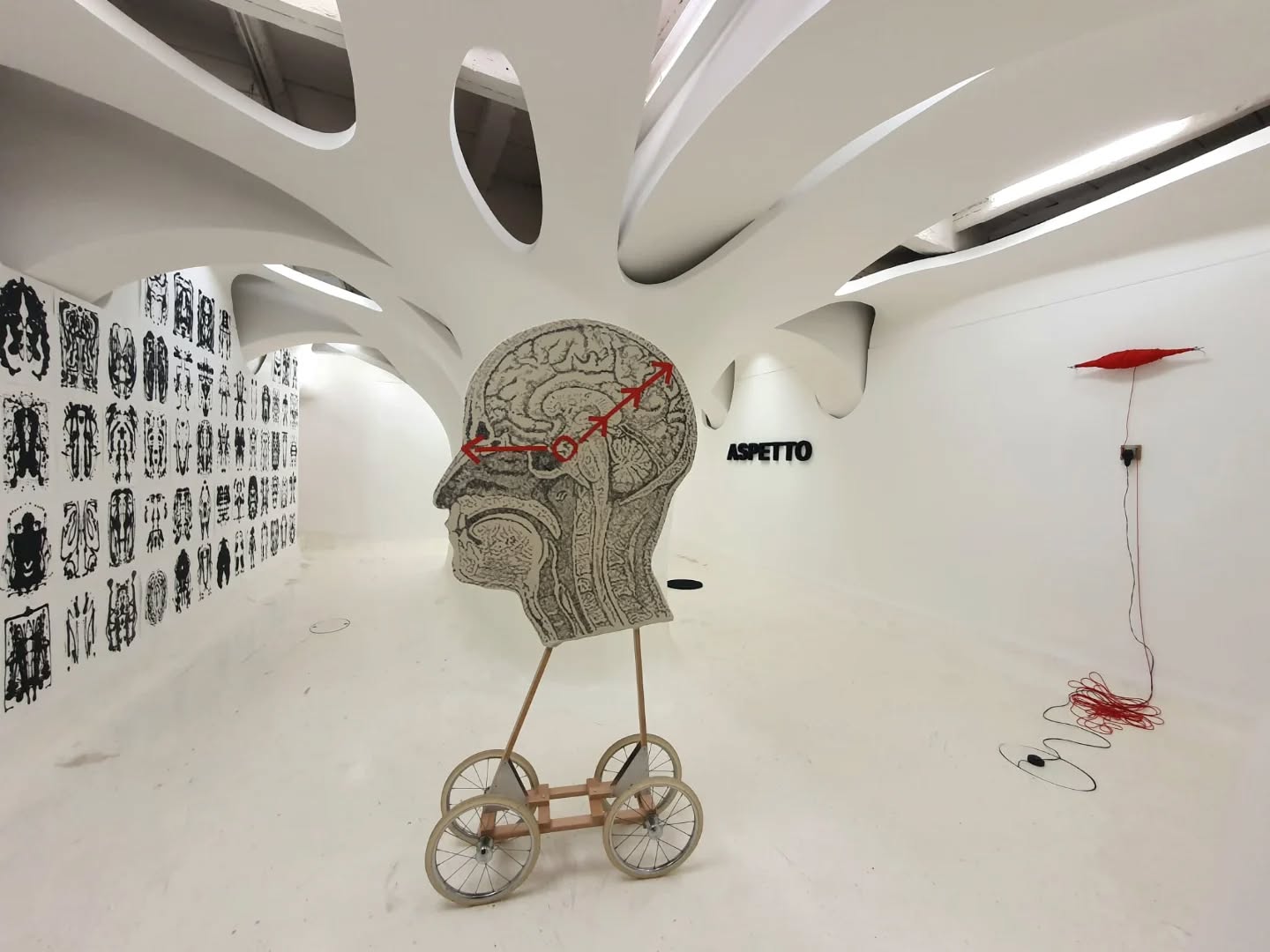 Com’è noto, negli esseri umani, la gestione delle emozioni, soprattutto di paura e di ansia provocate da pericoli ambientali e cognizioni sociali, è regolata dall’amigdala. E, non a caso, Amigdala, una sua rappresentazione grafica con i flussi emozionali, apre tutto il percorso espositivo. Quelle emozioni che possono trovare espressione e consistenza attraverso l’esplorazione delle tavole di Rorchach, che Marco Bernardi rielabora in S-macchie, la grande installazione a parete, composta da circa 90 fogli su cui ha steso delle macchie di vernice nera. Per questo, ASPETTO, la parola installata a parete, acquista una doppia valenza: indicare l’apparenza esteriore, se letto come sostantivo, nonché attesa di qualcuno o qualcosa, se letta come voce verbale.