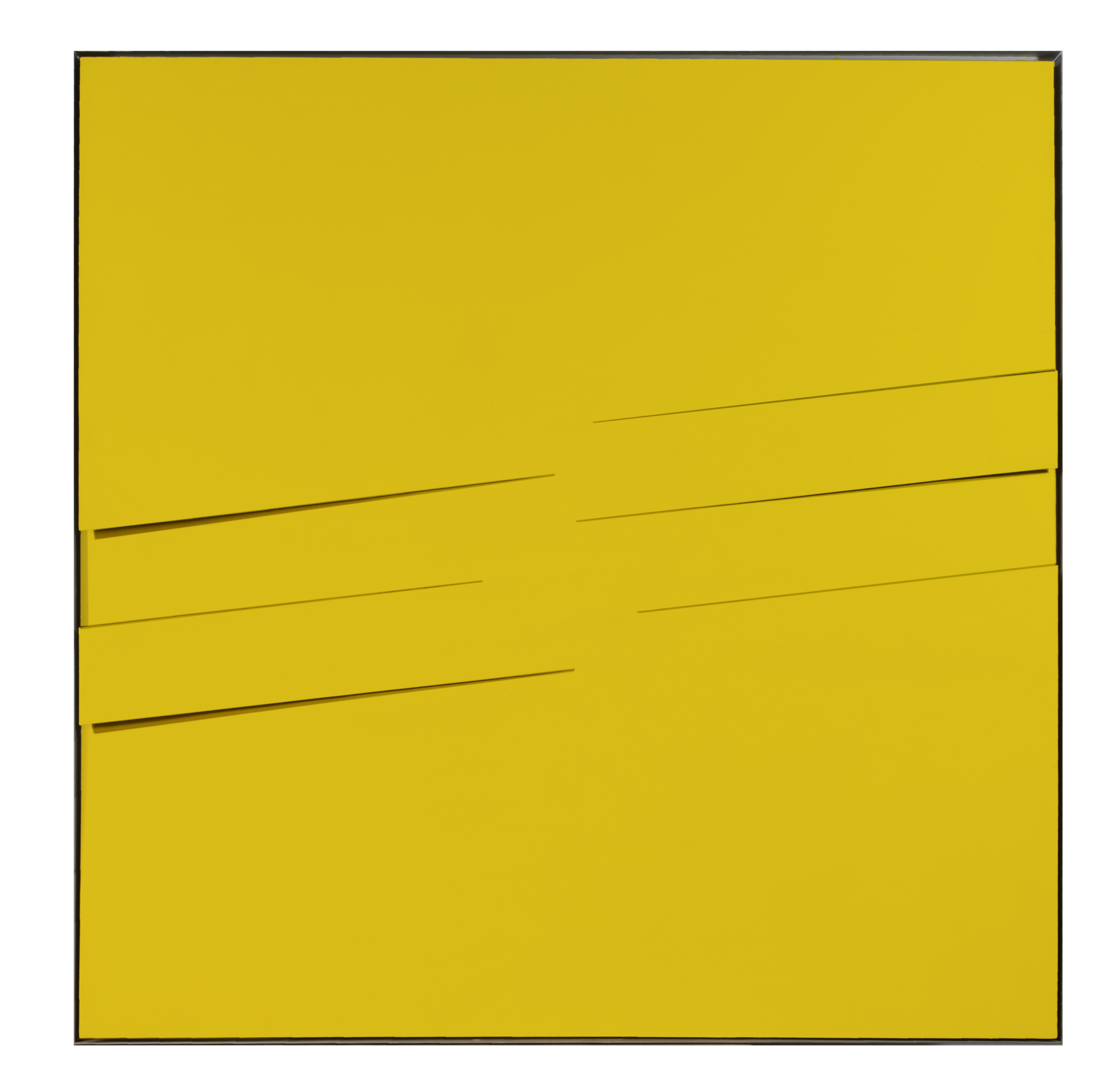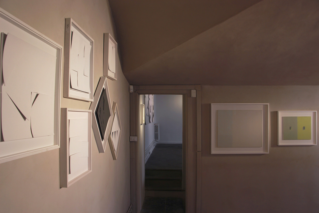 «La mostra è introdotta, nella vetrina che si apre sulle corte interna, da un grande Inciso giallo su lamiera. Nella prima sala della galleria, oltre a un altro inciso giallo, sono presentati un raro Inciso bicolore, bianco e nero, del 1968, tre Incisi grigi dei primi anni Settanta, disposti a trittico e alcuni fotogrammi: questi ultimi rappresentano un interessante lavoro parallelo dell’artista, realizzato incidendo fogli di carta nera e poi lasciando trapelare la luce attraverso questi tagli sulla carta fotografica. Al piano di sopra, una stanza è dedicata al confronto diretto tra alcune composizioni di piccola dimensione di Surbone e una scelta di opere di Calderara; mentre nella sala più grande sono presentati cinque Incisi bianchi, realizzati tra il 1969 e il 1972, che creano una sorta di ambiente metafisico, memore della ricerca astratta di Melotti e dell’arte ambientale».
