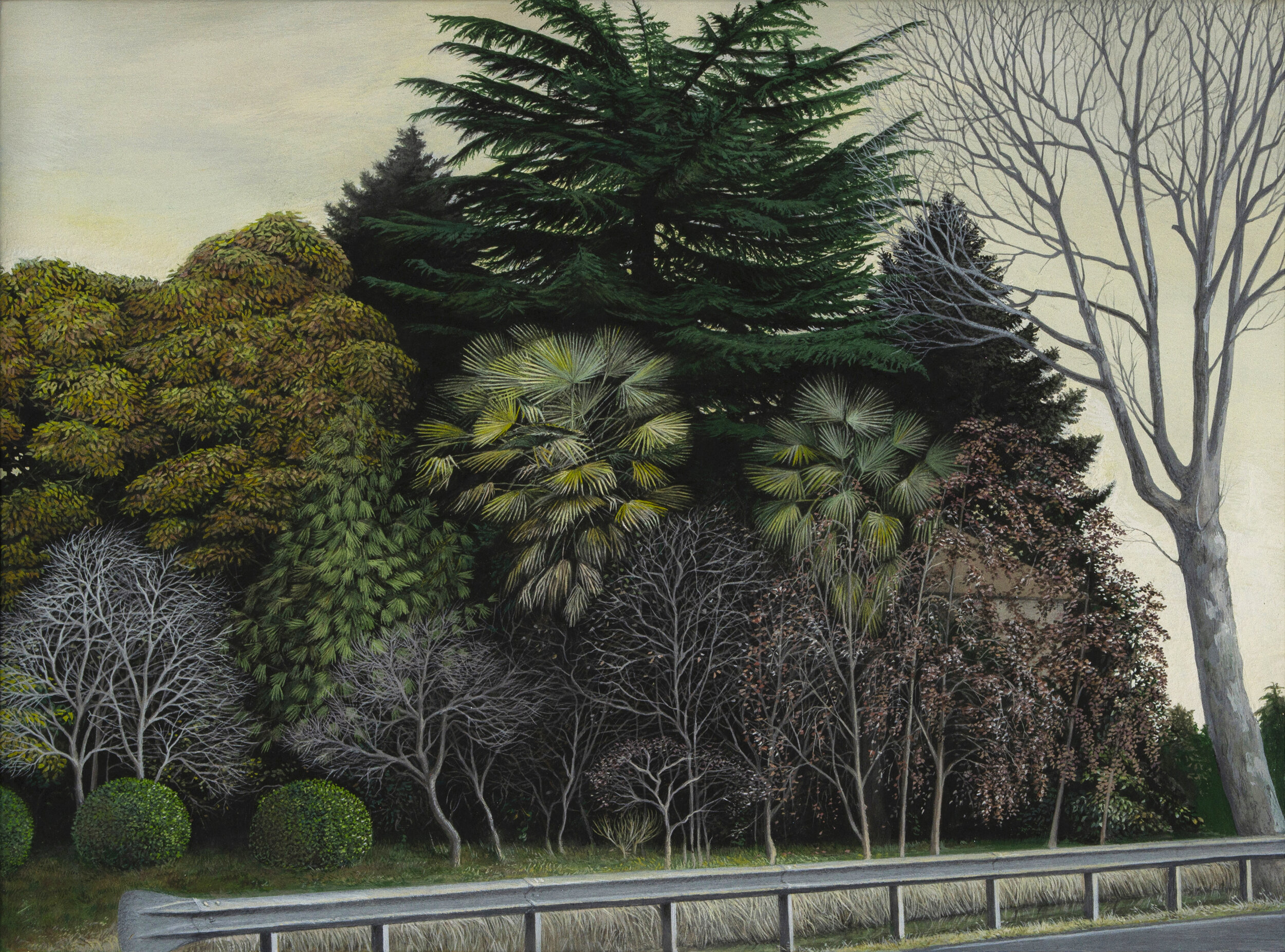 La pittura di Marta Naturale si nutre di un particolarismo quasi ossessivo che rappresenta le immagini prescelte nei loro minimi particolari. Tra gli alberi e i cespugli delle opere di “La passeggiata” sembra esserci l’impressione che, in queste linee così definite, da un momento all’altro stia per accadere un movimento. Allo stesso modo, un’ambigua luce accesa sulla facciata di una casa è la traccia del passaggio di una presenza umana. Infatti, quel che più cattura l’artista nella sua ricerca è quel lato straniante della realtà. Lo si percepisce passeggiando con lo sguardo da un dipinto all’altro, immersi in un’atmosfera che a volte sembra quasi cinematografica. Concentrando l’attenzione in queste opere di piccolo formato, l’occhio si sposta da un dettaglio a un altro, presto inseguito dalla sensazione che in quella finestrella sulla realtà stia per succedere qualcosa.