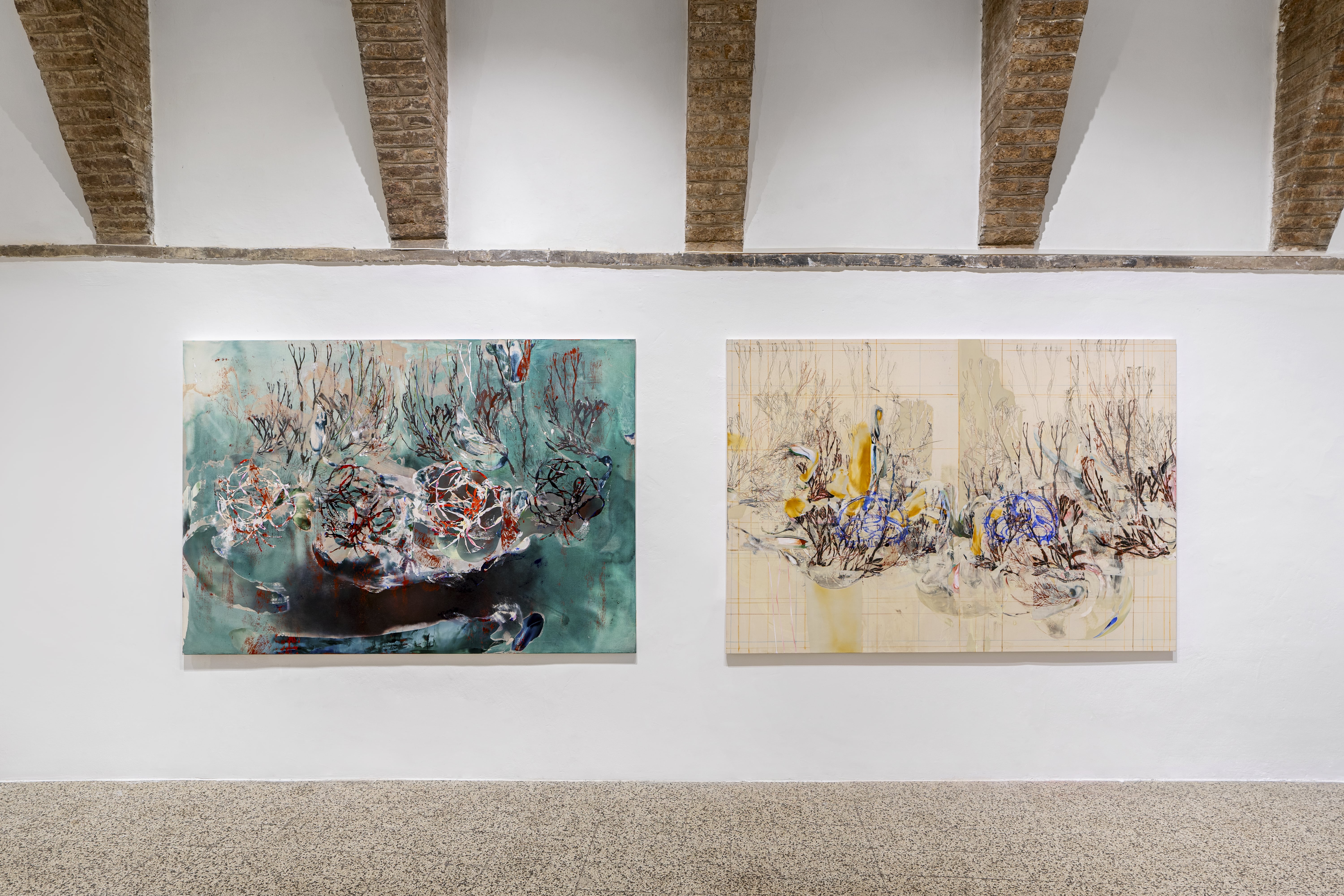 Questa danza erratica delle alghe è spesso inframmezzata da figurine impercettibili che fanno capolino tra i gracili filamenti. Un diavolo giallo, animali, creature sconosciute: esseri che ricostituiscono il confine sottile tra caos e cosmo. L’articolazione confusa delle alghe si ricompone, quindi, in piccoli elementi figurati, quasi epifanie, correlati al rapporto simbiotico tra la natura e gli esseri viventi.