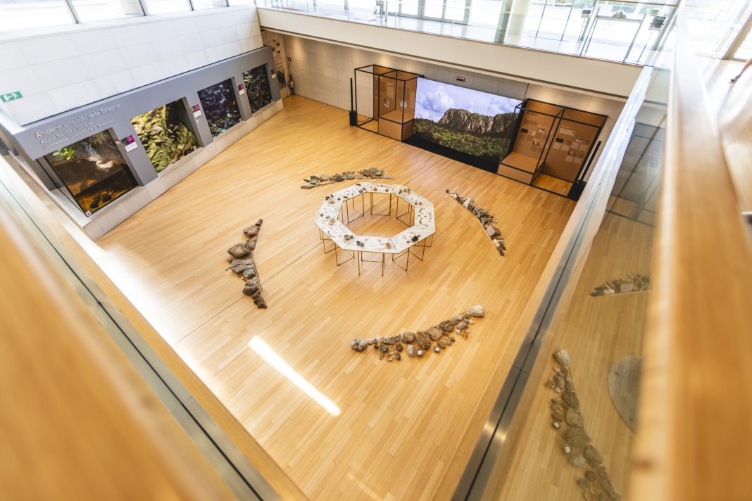 Ad accompagnare il visitatore in questa riscoperta di relazione con il mondo che abita, una pluralità di voci e immagini invitano a riscrivere l’interpretazione immobile che abbiamo di questi aspetti della nostra vita. Le storie e i nuovi panorami sono protagonisti delle narrazioni che si dispiegano lungo le pareti della “piazzetta”. Quattro sono gli approfondimenti che arricchiscono il percorso e offrono ulteriori spunti di riflessione, dal legame indissolubile e ancestrale che ci lega alle rocce e ai minerali alla loro capacità di poterci dare indizi sul futuro. È un percorso espositivo che mette il visitatore davanti alla propria storia e al proprio futuro, così come allo stesso modo i fossili che abitano le stratificazioni geologiche ci raccontano di noi e del nostro impatto sul pianeta, sia esso di evoluzione o di distruzione.