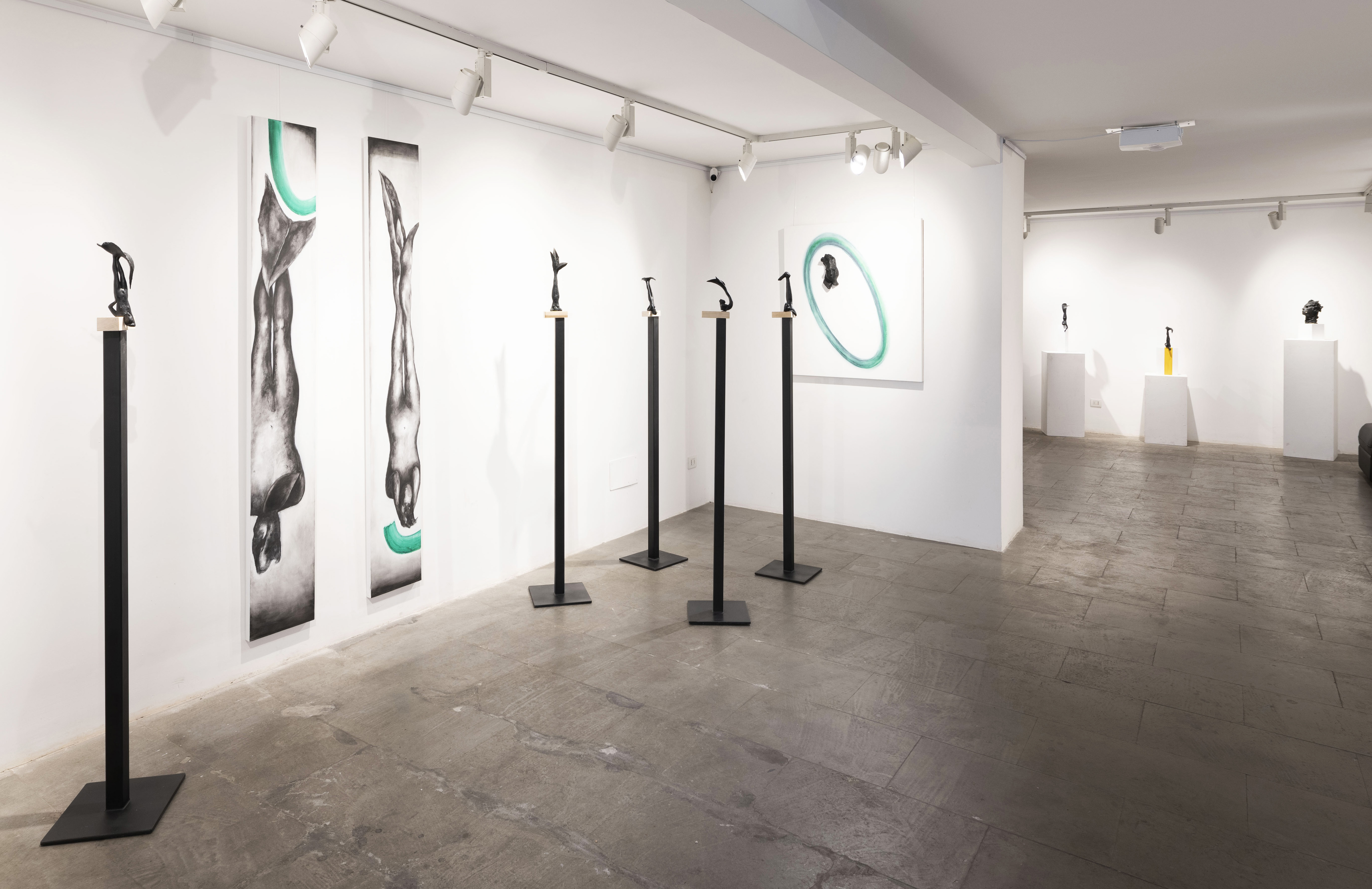 Esili sagome umane in bronzo svettano su alti piedistalli neri, aggrappandosi con le braccia a tasselli di legno chiaro e allo sguardo di chi le osserva. Sulle pareti, evanescenti orbite verde acqua conciliano il loro equilibrio, circondando enormi disegni di figure mutanti e volti in ceramica assorti in contemplazione.