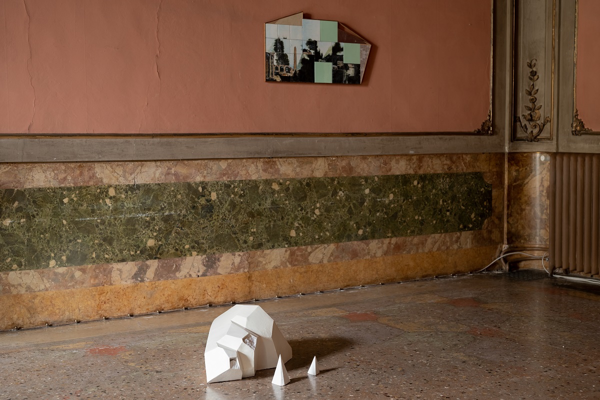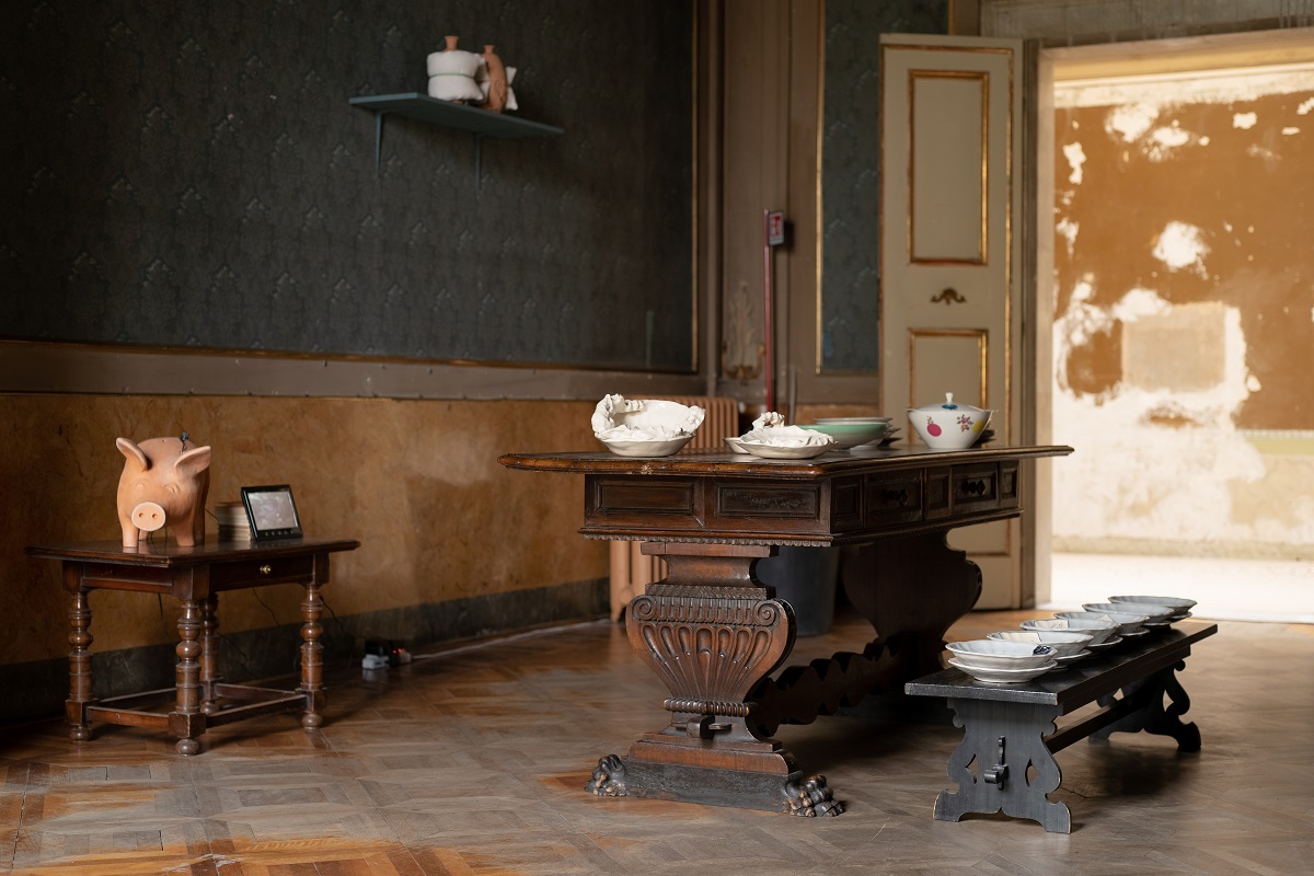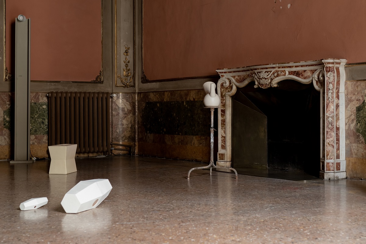 La mostra prosegue con una ricca riflessione tra ceramica e oggetti del quotidiano, come i piatti del Servizio Osseo di Sissi o Venerdì di Maurizio Mercuri, porcellino salvadanaio che monitora i risparmi con una micro-telecamera. Il tono giocoso di Pixelandia di Eva Marisaldi – coriandoli di porcellana colorata gettati sul pavimento – dialoga con l’ironia romantica di Prove di Volo di Ornaghi & Prestinari: una coppia di vasi domestici foderati da stoffa per attutire una possibile caduta durante il salto. Una teca conserva invece Toothpick di Sislej Xhafa, una riproduzione perfetta dello stuzzicadenti che il nonno sfoggiava dopo pranzo per strada, simbolo del riscatto dalla povertà. Ancora, la Madonna di Alberto Garutti tenta un avvicinamento dell’icona sacra al suo lato umano, usando un sistema di riscaldamento per portare la temperatura della scultura a quella corporea di 37 gradi.