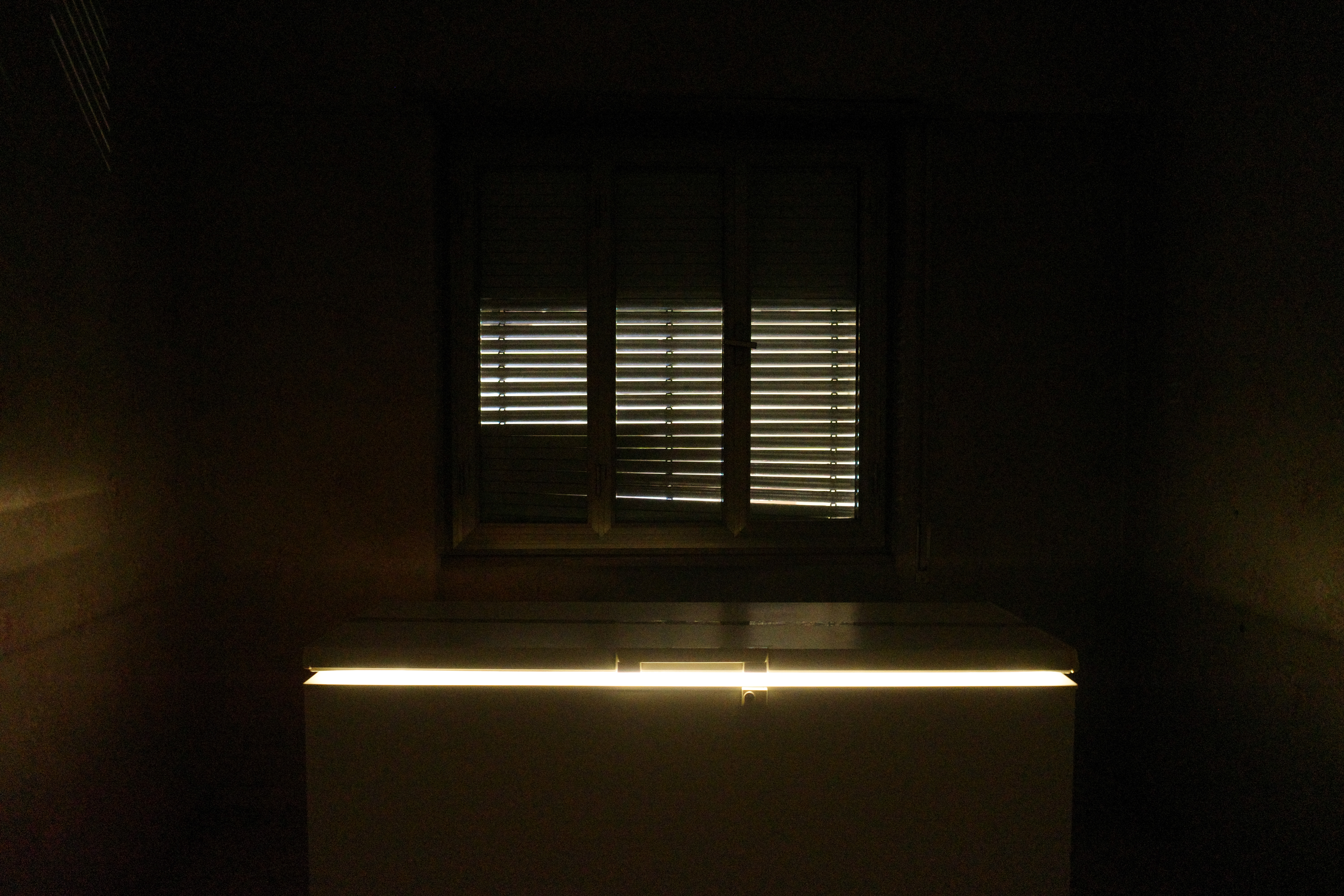 Nell’ultima stanza la seconda installazione di questa mostra: Eternità. Una stanza buia, la finestra con la tapparella socchiusa, una canzone che risuona ripetutamente sul silenzio. Al centro, un frigorifero disposto orizzontalmente che non si può aprire né chiudere…cos’è che nasconde? Da dentro filtra una luce che accende la nostra curiosità. Una radio emette “Eternità”, canzone che i Camaleonti suonavano negli anni Settanta, decennio famoso in quanto a delitti. Anche qui, qualcosa è accaduto… o sta per accadere?