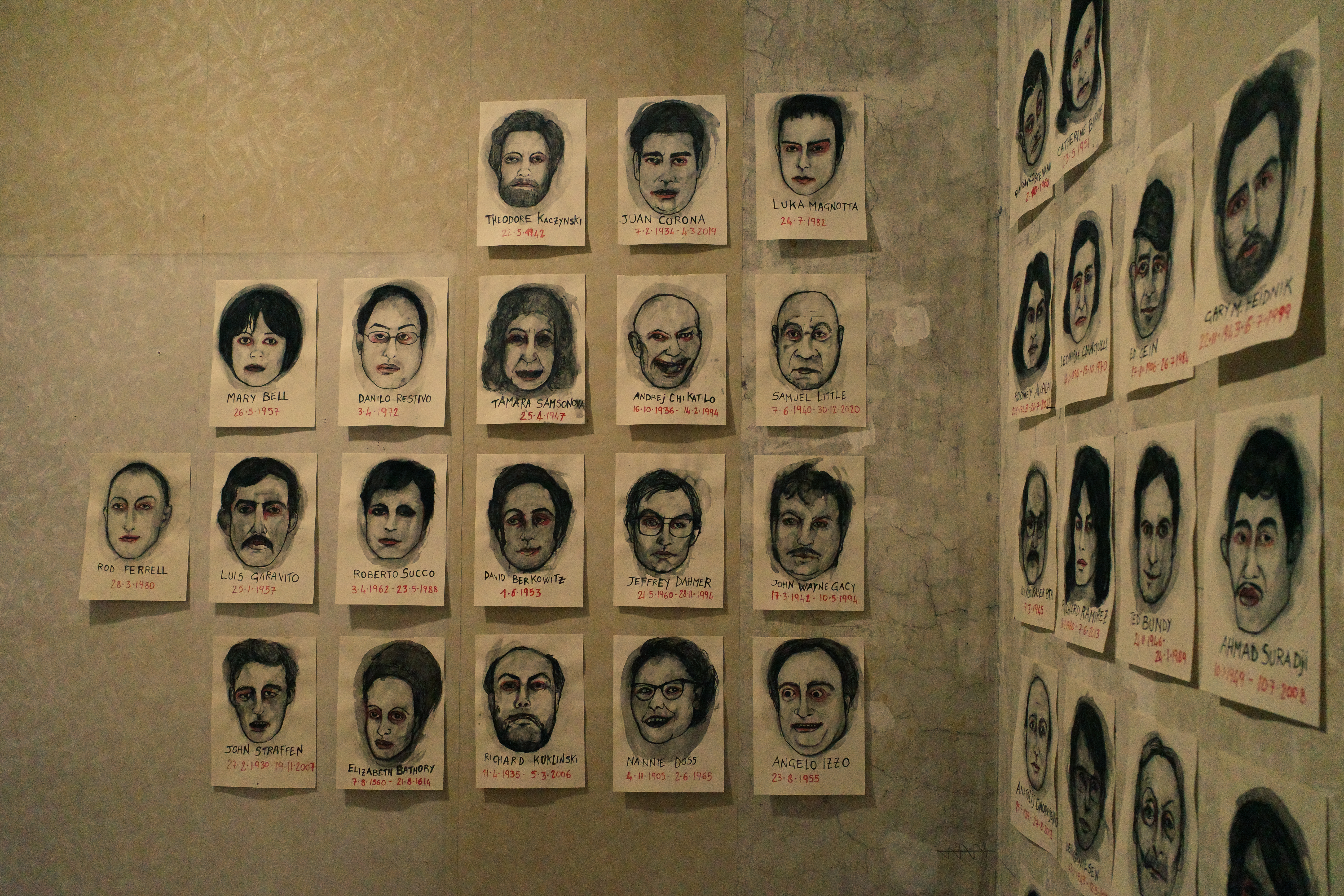 Raccolti gli indizi in questa stanza e usciti di qui, si torna al punto di partenza, tra le mura consunte della casa: una parete è ricoperta da una serie di identikit. Un volto, un nome e un cognome, data di nascita e di morte: sono i visi dal colore cadaverico di famosi serial killers. “Riunione di condominio” nasce proprio da questa serie di ritratti che l’artista rende opere leggendoli come icone moderne. «L’elemento macabro è presente, l’elemento macabro è assente. Questo lo decide chi guarda l’opera, che diventa perturbante a seconda dell’esperienza del fruitore. La mia riunione di condominio è un fraintendimento o forse no.»