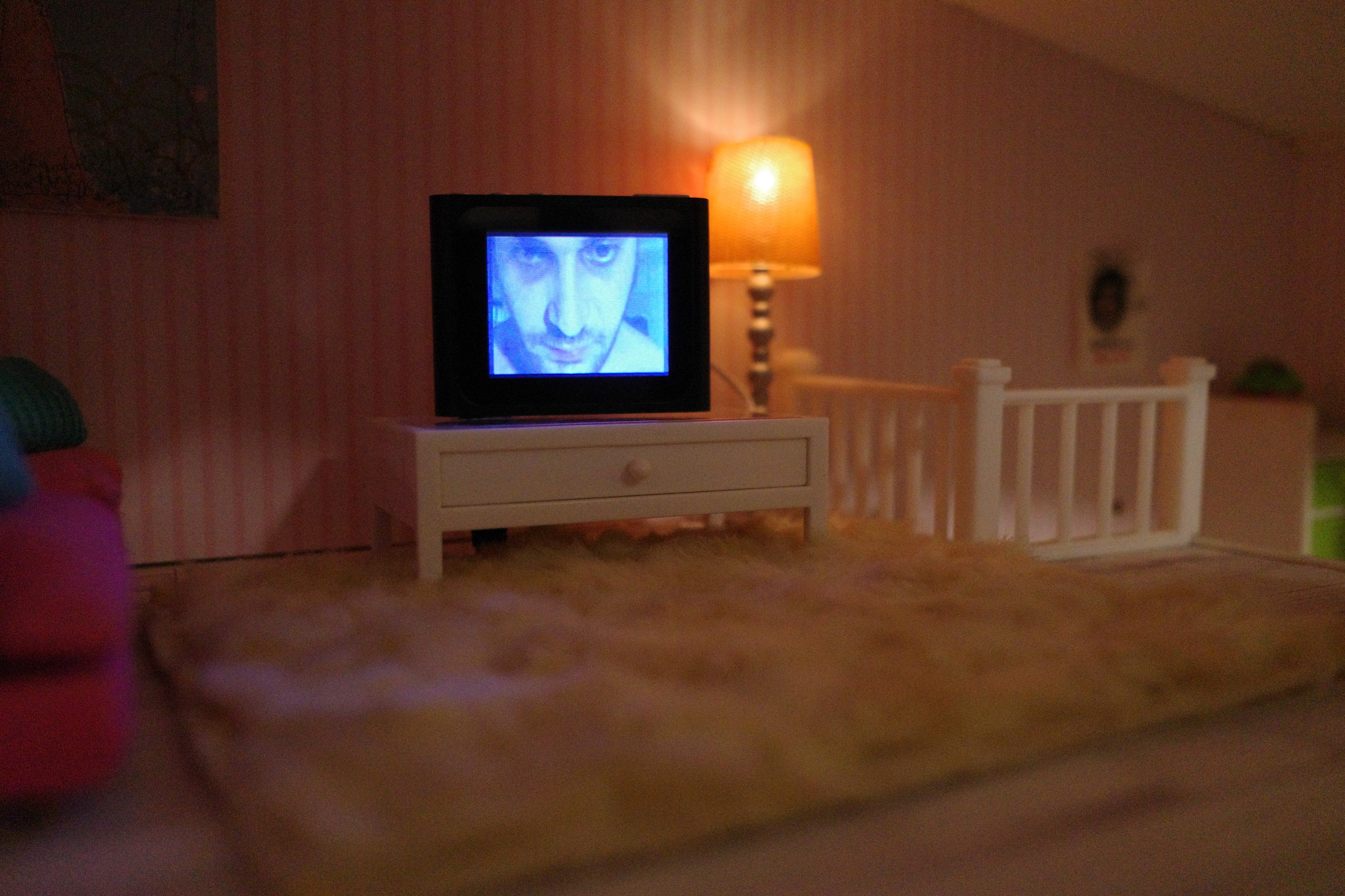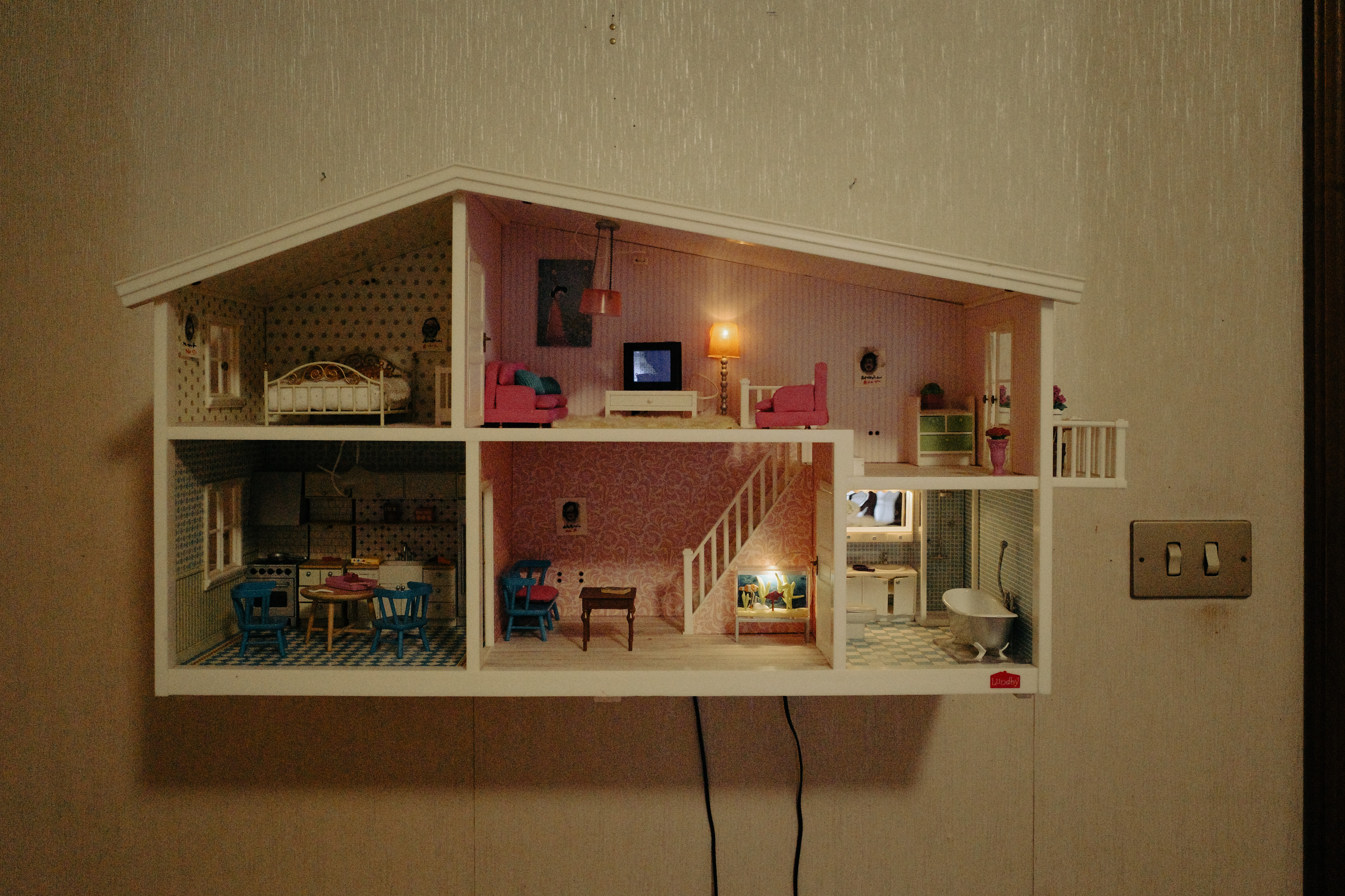Tutto sembra disposto ordinatamente, come se qualcosa stesse per avvenire o fosse appena avvenuto. Tutto sembra calcolato, con la stessa precisione maniacale della miniatura di una casa di bambole che troviamo appesa al muro. Dentro di questa un arredamento e dei colori così candidi e precisi degni di un killer psicopatico, infatti ci starebbero a pennello anche due piccolissime gemelle Grady. Invece, disseminati sulle pareti di questa casa in miniatura qualche mini-ritratto – forse di vittime – e poi, un video creato da Natascia Abbattista dal tono ironicamente splatter.