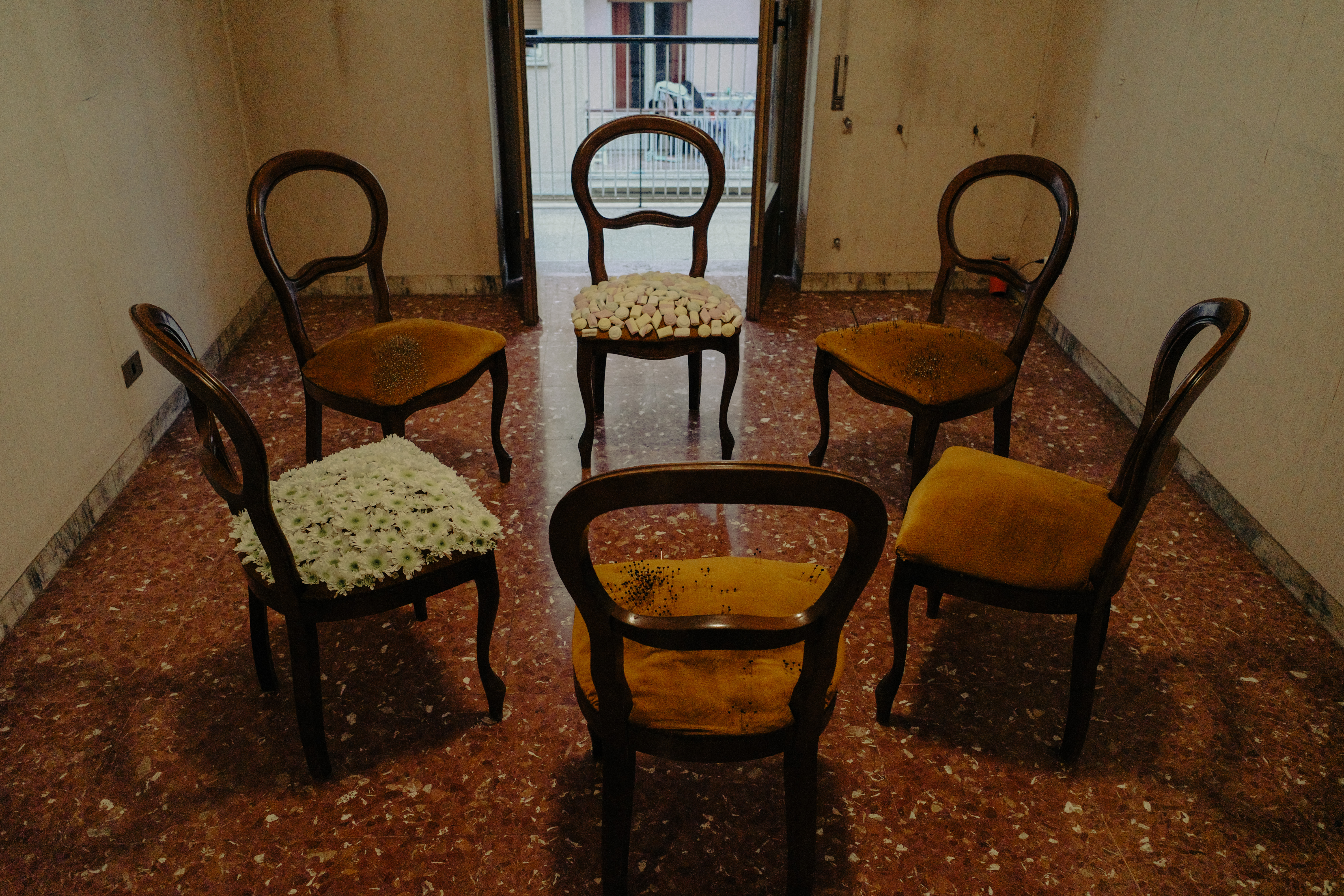 Appena entrati in Casa Vuota è un bivio ad accogliere il visitatore. Di fronte, oltre la soglia della prima stanza, delle sedie messe in cerchio e delle voci in sottofondo; a sinistra una parete ricoperta di identikit e poi una porta chiusa, che aspetta di essere aperta. Sei sedie disposte come aspettassero l’incontro di più persone ma in realtà solo su di una ci si può sedere, per un’inconsueta riunione di condominio. Dettagli deliziosi e anche pungenti: fiori, marshmallows, spilli e chiodi ricoprono le sedute in attesa di questo appuntamento.