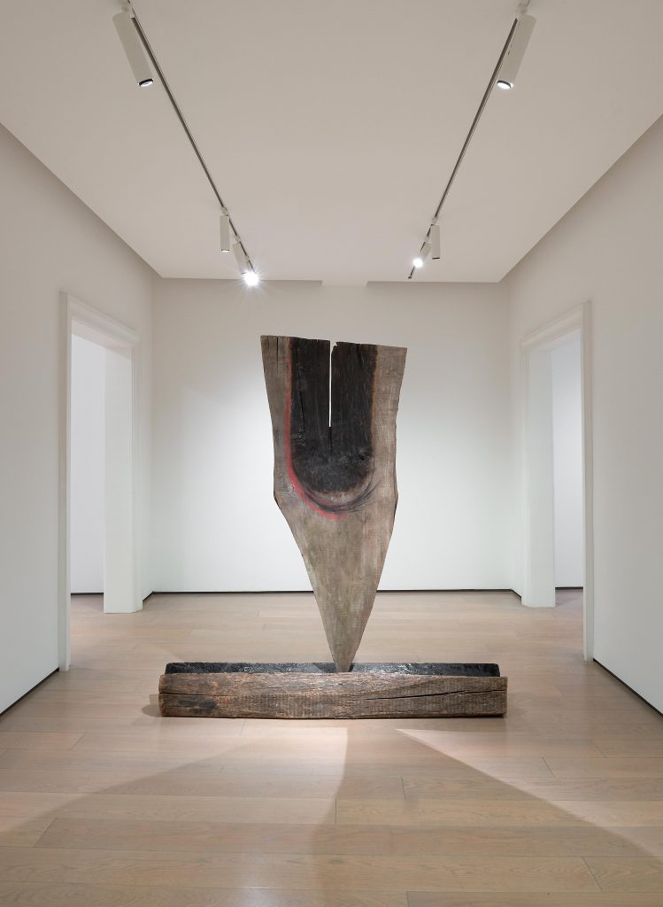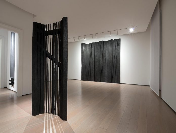 In alcuni punti della galleria si avverte il profumo del rovere bruciato, rendendo l’esperienza non solo visiva, ma anche olfattiva. Un richiamo primordiale, che sembra trasportare il visitatore all’interno di una foresta di fronde, avvolgendolo e insieme respingendolo. L’opera Tentazione (1989) incarna perfettamente questa ambiguità: la sua forma semicircolare sembra accogliere e al tempo stesso respingere l’osservatore, evocando la stessa potenza oscura e impenetrabile delle sculture lignee dell’amico Giuseppe Gallo. E al tempo stesso ricordando la carica erotica di quelle accennate semitrasparenze del panneggio fidiaco a effetto bagnato sui corpi sinuosi delle dee al Partenone.