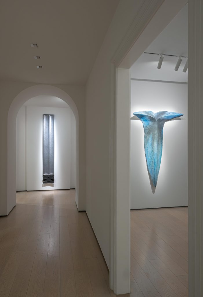 Negli anni Ottanta, Nunzio lavora prevalentemente con tre materiali: gesso, piombo e legno. Nei primi anni del decennio si concentra soprattutto sul gesso, sfruttandone la malleabilità e la duttilità. Sperimenta anche con la gravità, appendendo al muro opere di grande formato che evocano il simbolismo e gli stati dell’inconscio, scavando e plasmando la materia. Spleen (1980), il cui titolo richiama inequivocabilmente Baudelaire, rimanda a quegli stati d’animo malinconici che sfuggono alla comprensione razionale. Allo stesso modo, Angelo (1985) e Demone (1985), posti frontalmente l’uno all’altro, sembrano incarnare le forze che governano la ragione e, più in generale, l’esistenza stessa: il divino e il demoniaco. Curioso è l’uso del colore blu per Angelo, su cui sembra impressa un’ombra più scura, come un negativo fotografico, una traccia ottenuta per radiazione. Un effetto che richiama forse il poeta Rimbaud, il quale associava il blu alla lettera O, “la suprema Tromba piena di stridi strani, silenzi attraversati dagli Angeli e dai Mondi”.