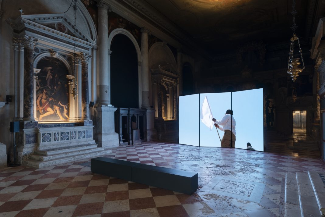 Cinthia Marcelle e Tiago Mata Machado riflettono, allegoricamente, sulle origini del capitalismo, sul colonialismo e sull’etnocidio con l’installazione a due canali Acumulação Primitiva (Accumulazione Primitiva, 2024); mentre Saodat Ismailova propone un viaggio visivo e poetico nell’eco culturale e politica che si è generata, attraverso secoli e luoghi diversi, dalle idee rivoluzionarie del profeta Al-Muqanna, una figura storica ambigua che ha vissuto in Asia centrale nell’VIII secolo (Melted into the Sun, 2024). Chiude il percorso Fritz (2024) di Diego Marcon, che mostra un ragazzino che canta uno jodel all’interno di una legnaia illuminata da un’alba autunnale. L’immagine è nitida e semplice, ancorata in un reale plausibile, fors’anche rassicurante ma al contempo incerta, inquietante. Fritz è metafora di tanti precari equilibri del nostro tempo: infanzia ed età adulta, essere al mondo ed essere senza mondo, essere umano ed essere burattino.