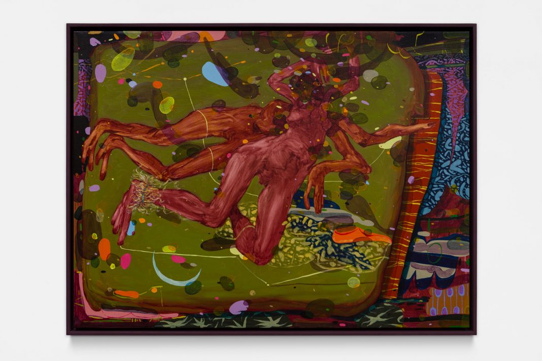 Nei lavori di Stuto in mostra alla Candy Snake Gallery la notte diventa spazio simbolico. Paesaggi notturni, giardini enigmatici e figure isolate emergono da campi cromatici saturi, dove il colore struttura l’intera visione. La luce non dissolve l’ombra, né l’ombra soverchia la luce, bensì il confronto rimane aperto, trattenuto in una tensione che anima la superficie pittorica.