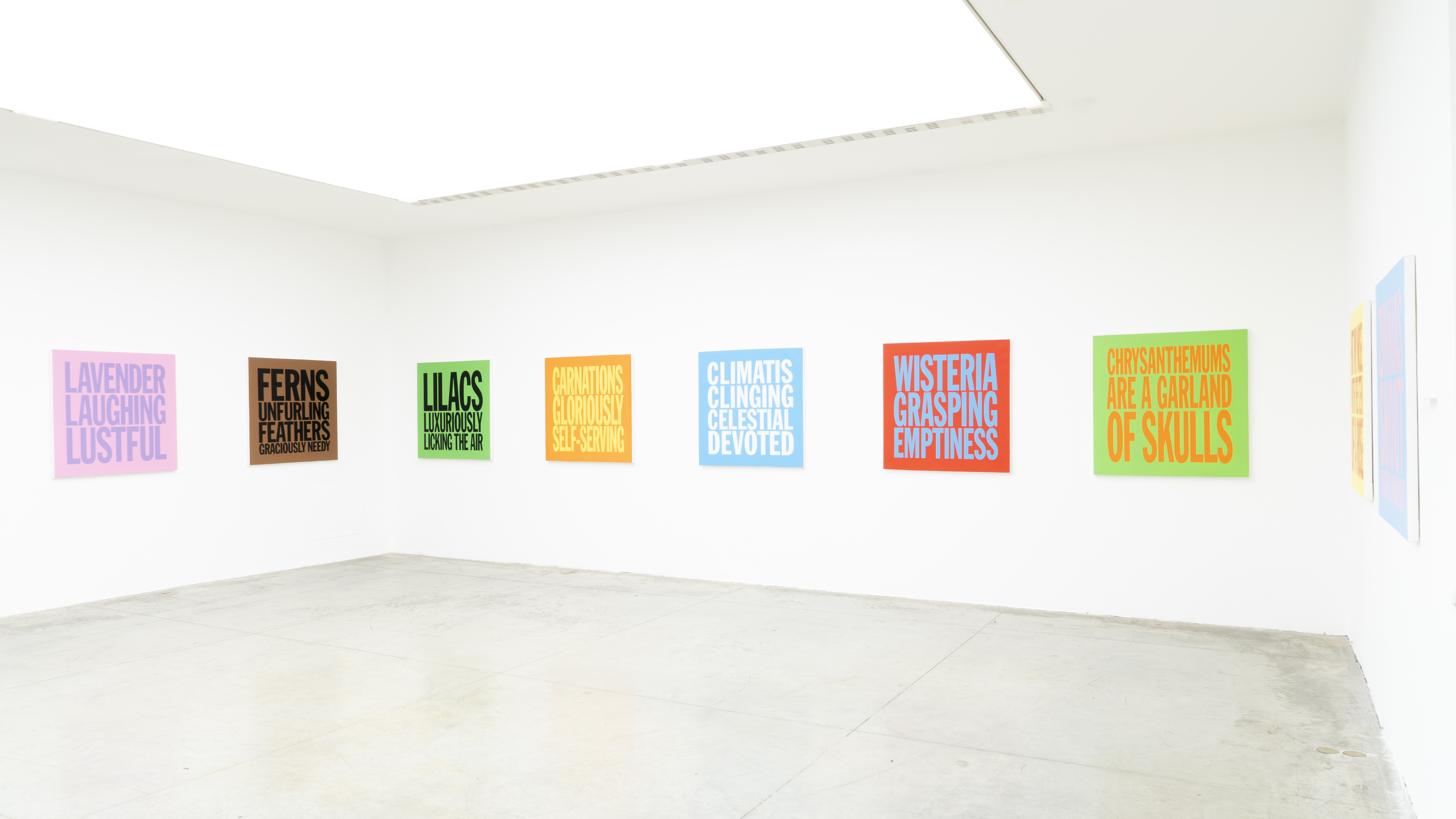 Partendo con la serie di tele Perfect Flowers, anch’essa piena di riverbero nel ritmo e nella dimensione alterna delle parole e nei versi scelti e sintetici stesi su tratti di colore acceso, la mostra chiude circolarmente con i Vinyl Paintings dell’89, con testi in bilico tra lo slogan e il mantra buddhista, i Black & White Paintings, avviati a partire dal 2010, e i Rainbow Paintings a sostegno della comunità LGBTQIA+. In mezzo l’iconica presentazione nella Sala delle Ciminiere, croce e delizia nelle intenzioni del suo curatore, concepita come grande navata o spazio in cui concentrare le opere di maggior attrazione sul piano allestitivo.