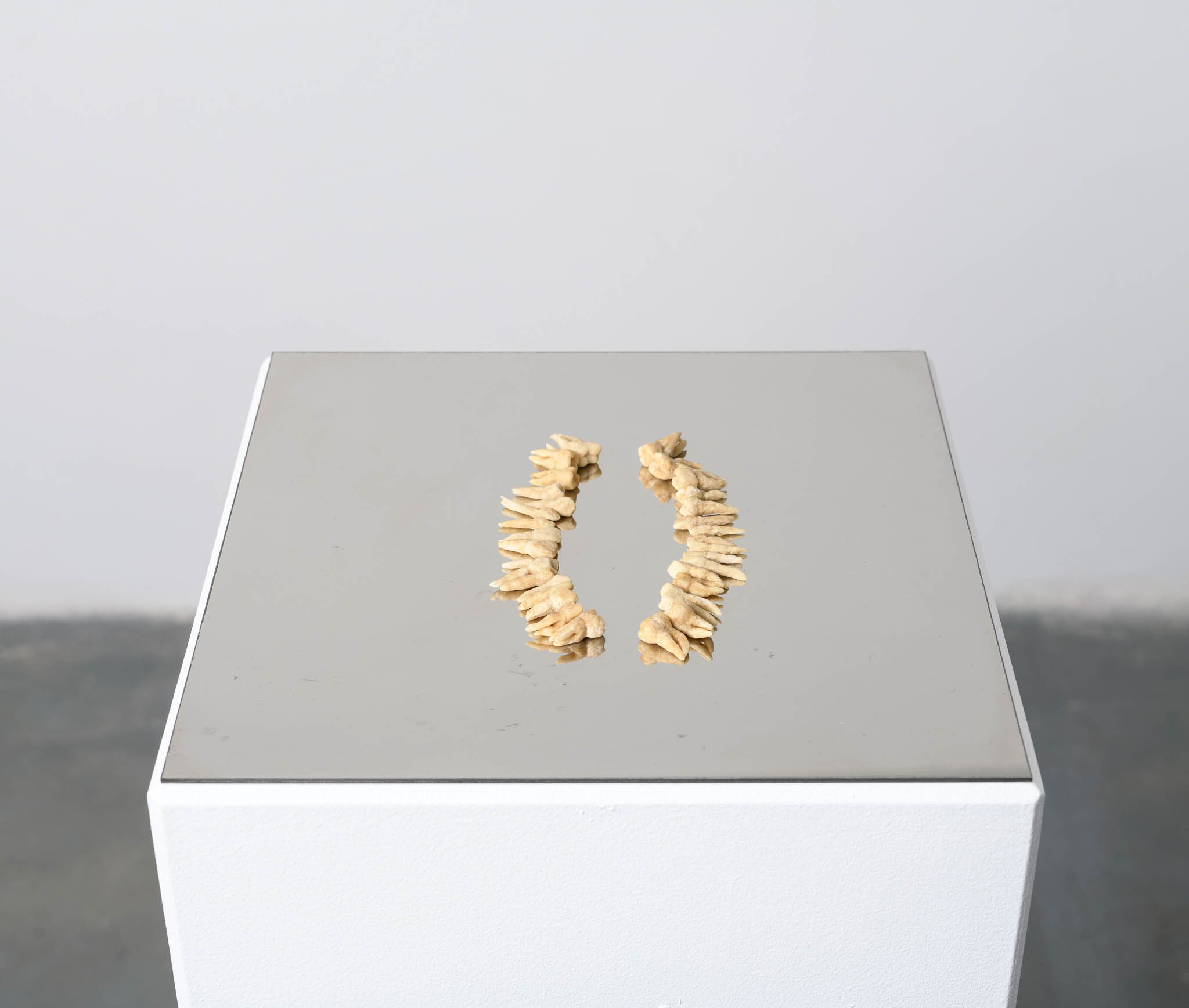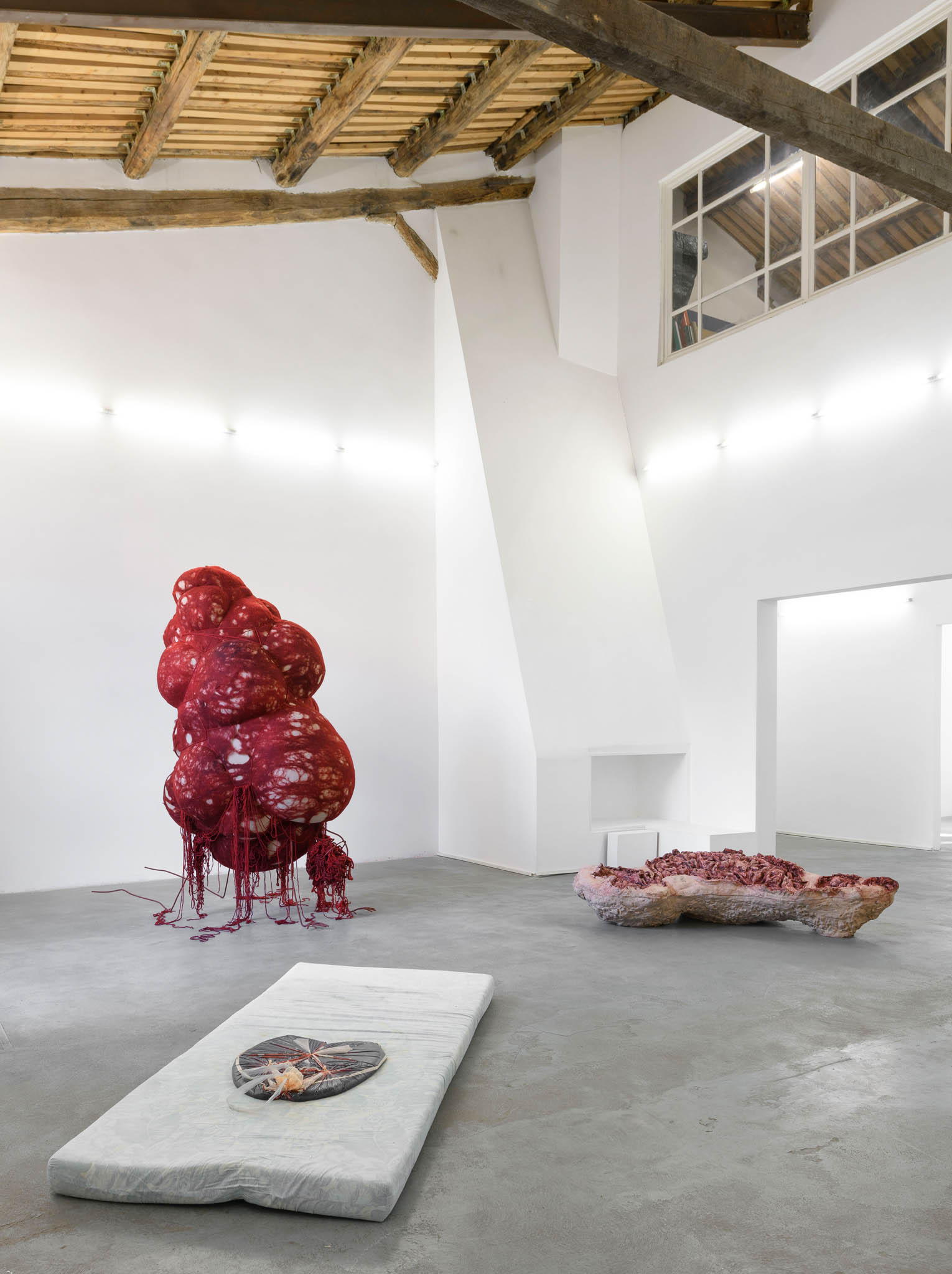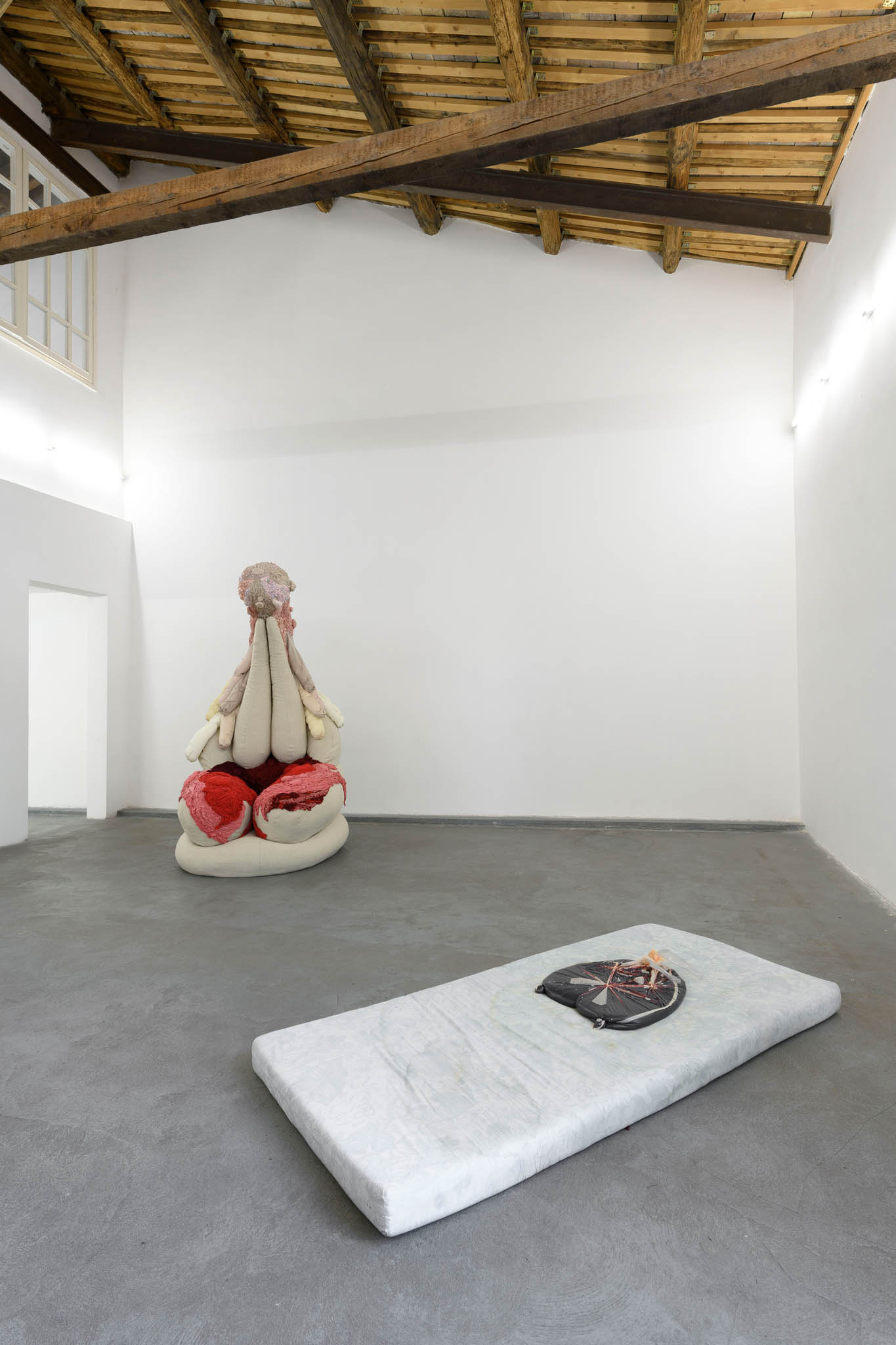 Spostandosi verso destra si incontra New Mom, il grido di speranza nel ricongiungersi con una figura protettiva: grande come un animale, maestosa come un trono. Si tratta di una scultura di stoffa dal forte valore simbolico, composta da pigiami e vestaglie appartenenti alla madre, emblema della degenza, che in questo contesto viene riscattata e trasformata in una plissettatura raffinata. New Mom è la grande madre silente che Tkáčová non ha sentito vegliare su di lei, è un luogo in cui ora può sprofondare. Seguono Net, una rete sospesa tessuta dall’artista con i propri capelli, simbolo dello spazio in cui si è sentita a lungo intrappolata, Teeth, denti in pasta di pane che richiamano la credenza popolare secondo cui, nei sogni, la loro caduta annuncia una disgrazia e Bedsheet un sudario che rimanda alla prolungata permanenza a letto.