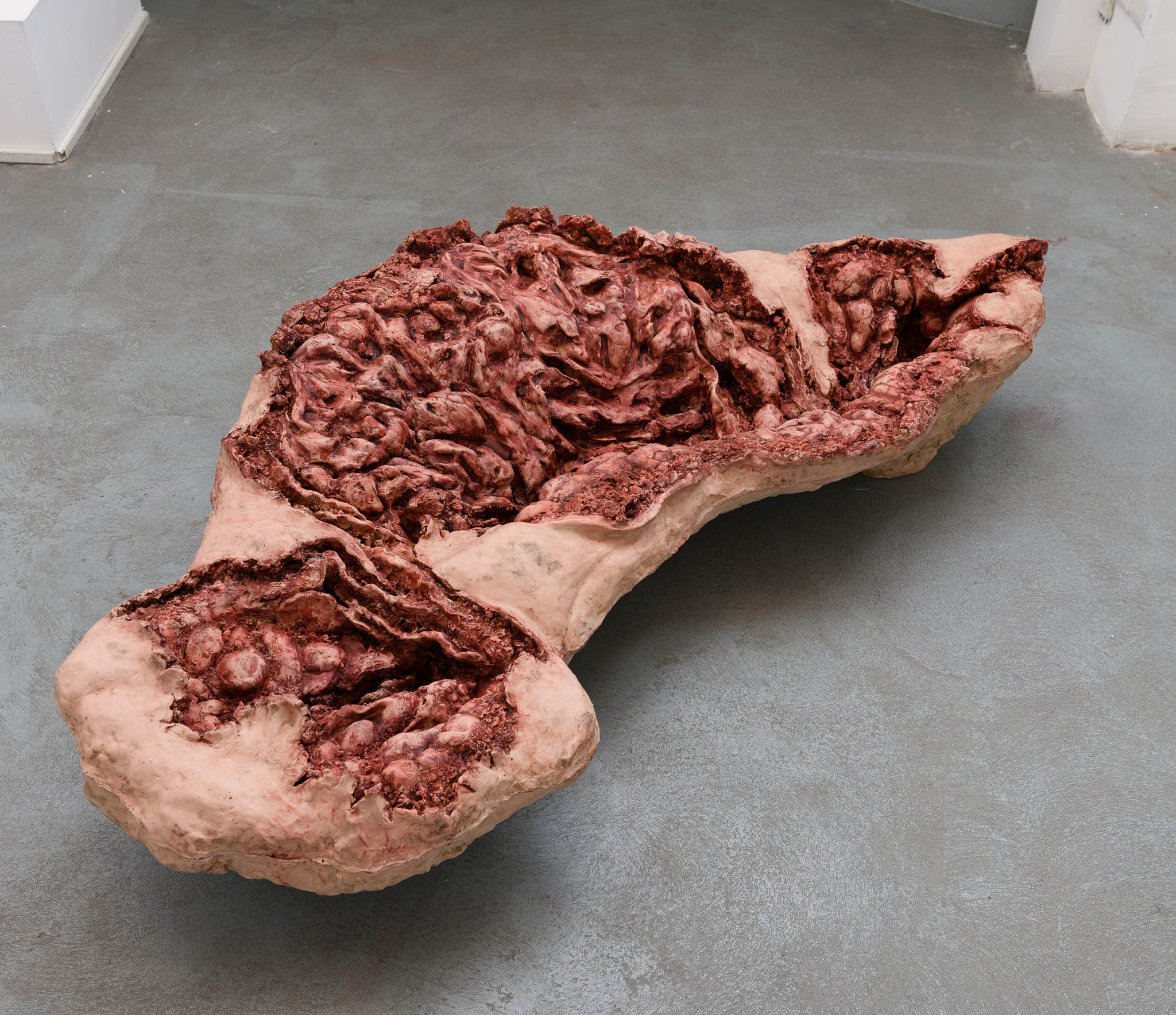 La scultura che mi accoglie entrando nello spazio sospeso di AlbumArte si chiama Burden. È una grande massa organica coperta da lana di un rosso scuro sanguinolento che disegna vene e capillari, copre e scopre allo stesso tempo. Metastasi o coagulo di sangue è un chiaro richiamo al peso che l’artista porta sulle spalle, prostrata a carponi a terra. Nella stanza sono presenti anche Wasted Cunt, opera cruda che rimanda al periodo di lunga degenza a causa dell’alcolismo della madre e Wound, scultura in silicone testimonianza di una ferita che non si rimargina, a causa della stessa dipendenza da cui anche il fratello è condizionato.