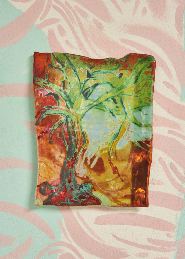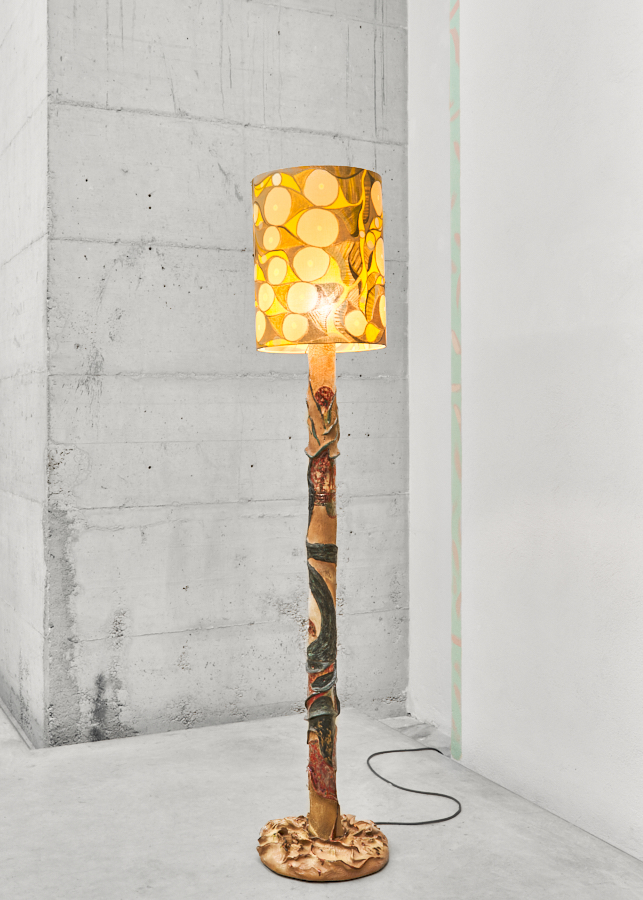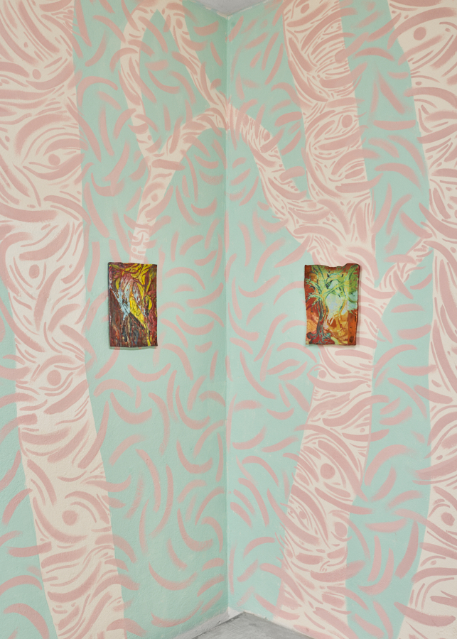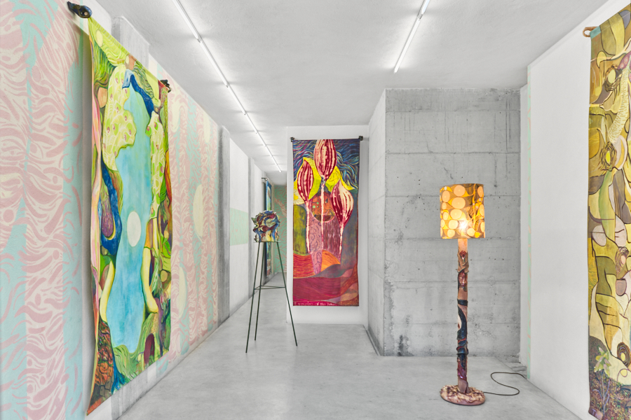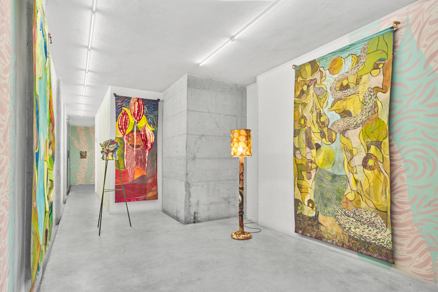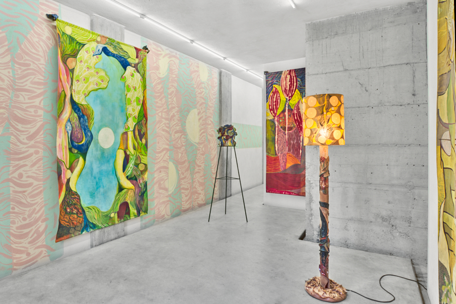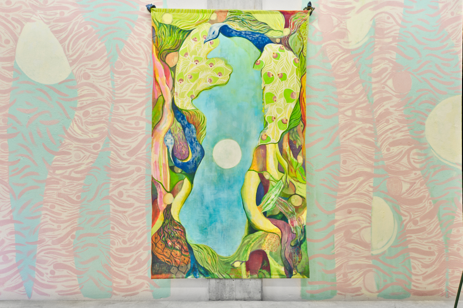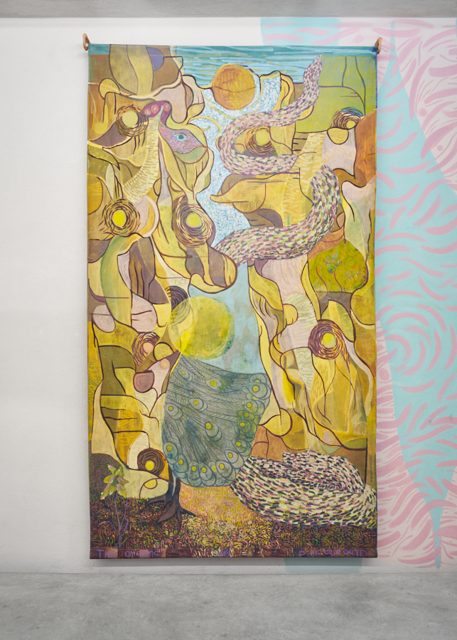 La mostra consiste in quattro tele dipinte, altrettante sculture in ceramica smaltata ed un wall painting che dimostrano l’estrema disinvoltura con cui l’artista si muove da una tecnica all’altra. Le tele, simili a tendaggi sorretti da preziosi perni in ceramica, riportano disegni che si rivelano al visitatore soltanto in seguito ad un’osservazione attenta e a distanza. La mano dell’artista si muove in tutta spontaneità e libertà – senza quindi un intento preciso di raffigurazione – su un tessuto di cotone colorato e poi candeggiato. Pertanto, il processo creativo sembra scaturire e farsi guidare direttamente dall’inconscio, il quale, però, finisce per rivelare forme e segni che coincidono con un universo da sempre caro all’artista: la natura.