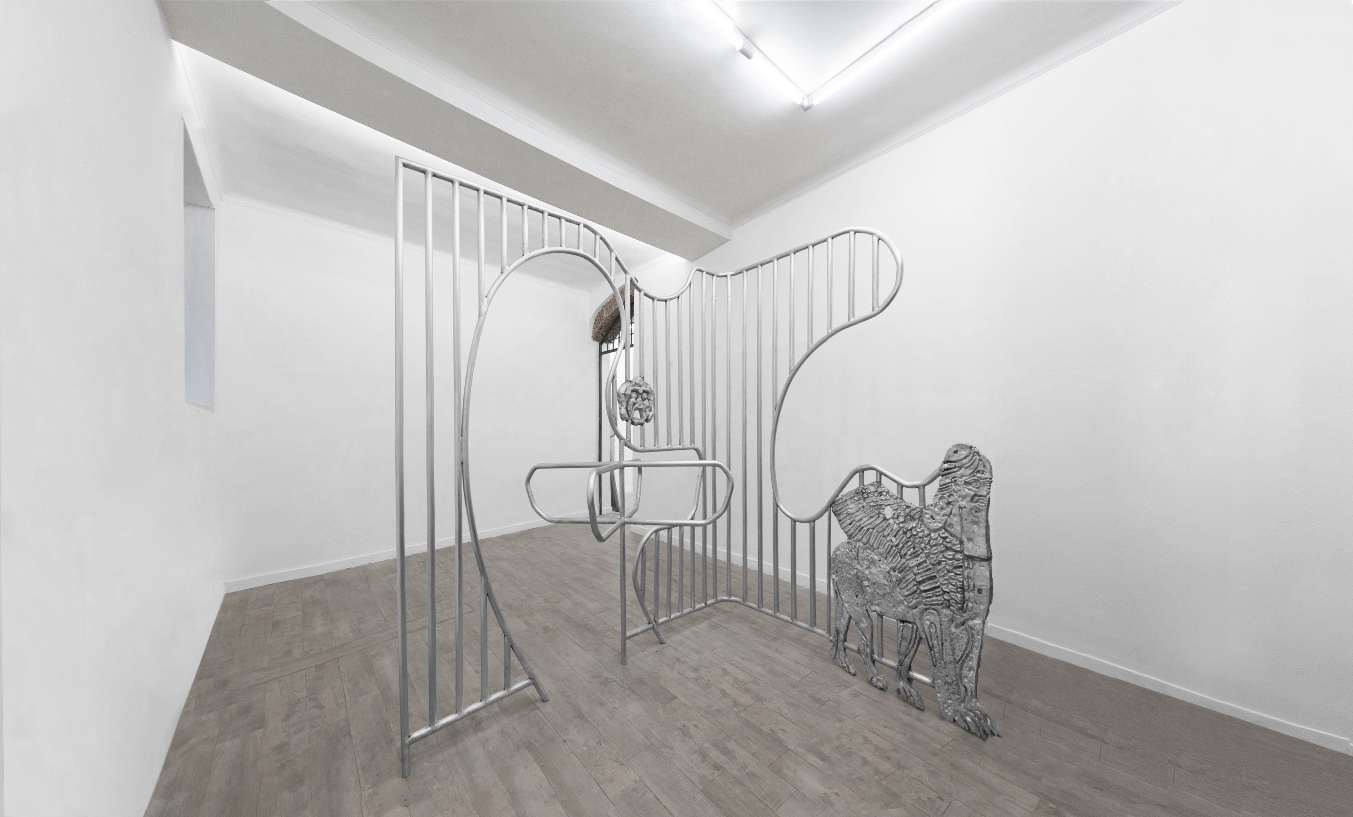 Astratte dalla dimensione caotica e assordante dello spazio urbano, le architetture di Nelson Pernisco trovano negli spazi della White Noise Gallery un rifugio dalla sovraesposizione alla quale sono quotidianamente soggette. L’artista preleva dall’immaginario urbano quegli elementi architettonici che più di altri sono stati oggetto di una contrazione della loro forma e identità, fino a scomparire in un’invisibilità che è mera funzione. Sono non-architetture: passaggi, tornelli, varchi, corrimano metallici e così via.
