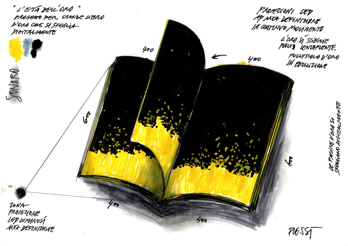 Un ulteriore aspetto determinate che emerge dall’esposizione Nero Oro è l’approccio di Fabrizio Plessi nei confronti dell’opera d’arte. Tutti i suoi lavori hanno origine da un foglio bianco, ed è su questo che il suo lavoro prende forma, concretizzandosi. La sacrestia ospita infatti solo alcuni dei suoi 16.000 disegni, che includono sia opere nuove che rielaborazioni di progetti passati, evidenziando un costante processo di rielaborazione e sviluppo delle tematiche precedenti in una prospettiva moderna.