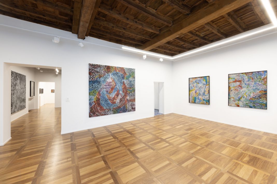 Il primo, frontale rispetto all’ingresso di Cortesi Gallery, è di grande impatto e di grande formato – misura 225×225 cm (Nets big )- e sembra restituire lo sguardo che gli si rivolge con una domanda ben precisa: cosa vedi? La risposta, Donzelli, la lascia tutta allo spettatore che si troverà – forse inevitabilmente – a utilizzare espressioni come «circa, pressappoco, poco meno che, come, come se fosse, simile a». Questi avverbi, queste locuzioni, non sono affatto casuali, sono infatti tutti sinonimi di «quasi», termine caro, e centrale, nella poetica dell’artista che proprio dal suo concetto di disegno del quasi ha sviluppato queste nuove opere che, come reti, catturano in un nuovo e sempre diverso incantesimo.