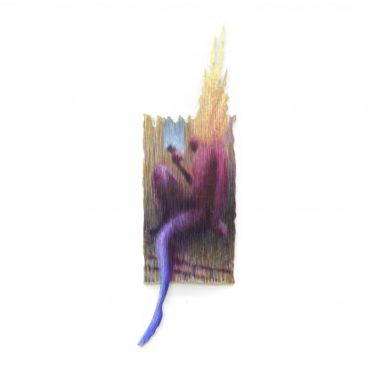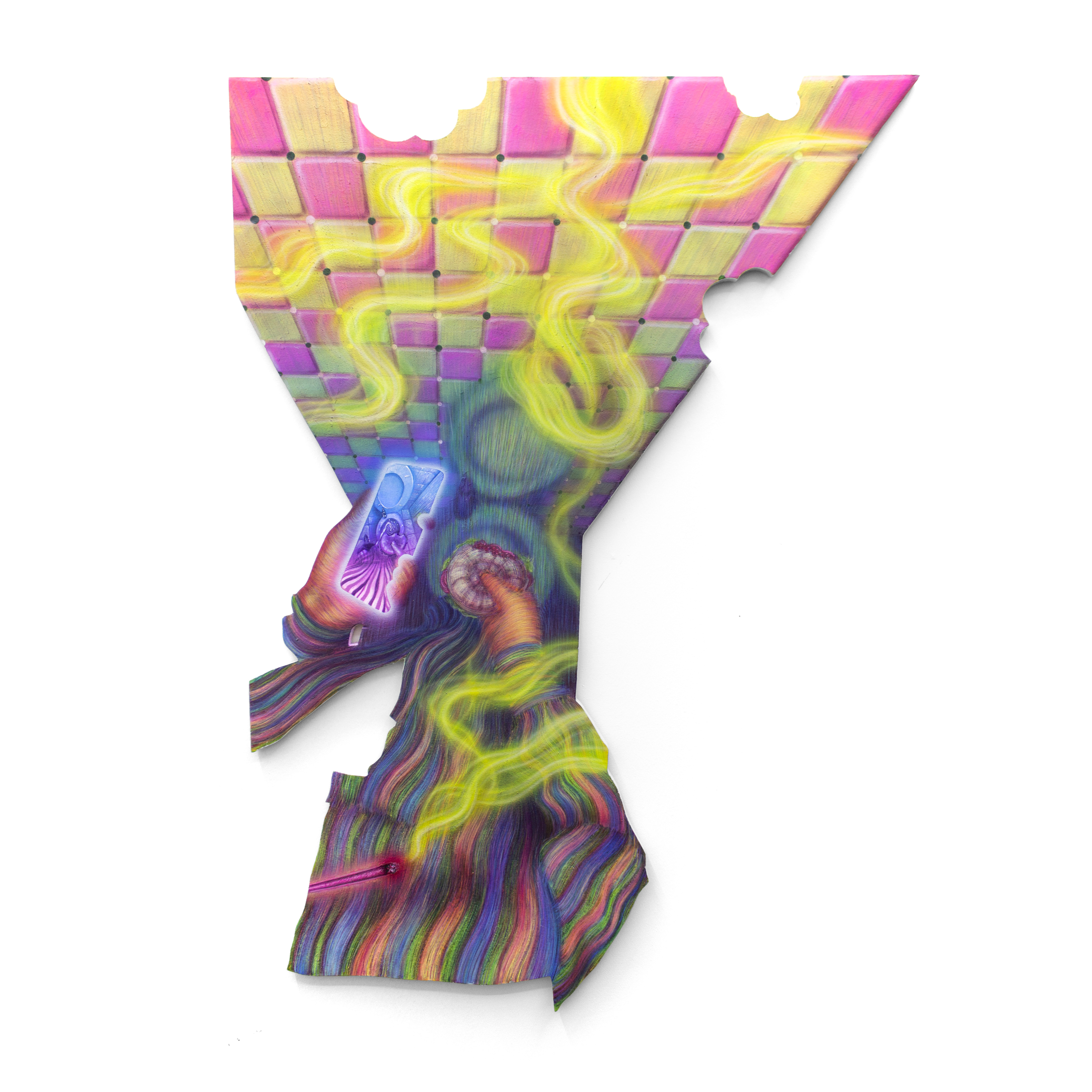 In “Collirio” è il ruolo stesso del pittore ad essere messo in discussione facendo i conti con una crisi del proprio linguaggio diventato sempre più limitato ma soprattutto schiacciato dall’avvento dei media digitali. Con i social network si è arrivati poi alla saturazione definitiva della comunicazione visiva, la quale ha incrementato in modo ossessivo i propri ritmi di produzione determinando un forte sconvolgimento nell’esperienza del fruitore che viene investito da un’inflazione di immagini senza precedenti. Ciò che ne consegue è da un lato il senso di nausea, rigetto per l’enorme mole di informazioni e, dall’altro, un impoverimento linguistico palese nella società contemporanea. Piscopo non è solamente un valido e talentuoso pittore, ma ricopre anche il ruolo di insegnante e, da questa prospettiva, ha potuto notare, in un periodo storico di DAD forzata, l’alienazione dei propri alunni che si perdevano davanti agli schermi, spesso rapiti dall’attrazione dei social network.