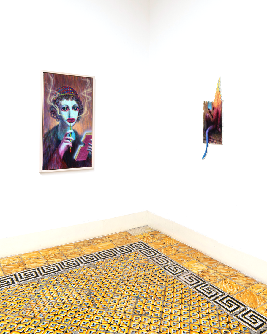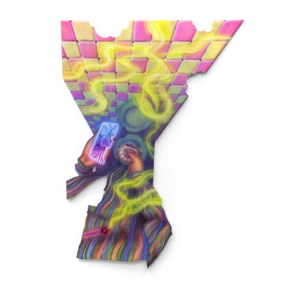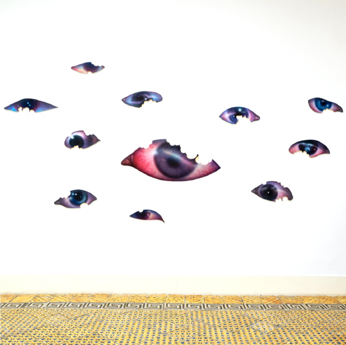 Da qui nascono le sue opere che riprendono soggetti celebri della storia dell’arte e della nostra società, riportate su tele del formato 16:9 e deformate come se vi fossero applicati dei filtri digitali, chiara allusione alle Instagram stories di cui tutti, o quasi, siamo artefici e vittime inconsapevoli. Su una delle pareti della galleria si stagliano poi, quasi minacciosi, una serie di occhi umani dipinti ad aerografo. Sono i Device, dispositivi intesi sia come elemento grazie ai quali ci è permessa la visione fisica, sia come strumento di controllo imposto dalla società. Questi device sono, allo stesso tempo, anche immagini che appartengono a personaggi famosi e, come tali, sono oggetto di consumo da parte dello spettatore, che le divora metaforicamente ma anche materialmente, come si può notare dai segni dei morsi presenti sulle opere esposte. Strumenti, dunque, dalle molteplici valenze, in grado di controllare l’essere umano, di influenzarlo e di nutrirlo rispondendo a una voglia avida, che lo conduce verso un meccanico svuotamento di se stesso.