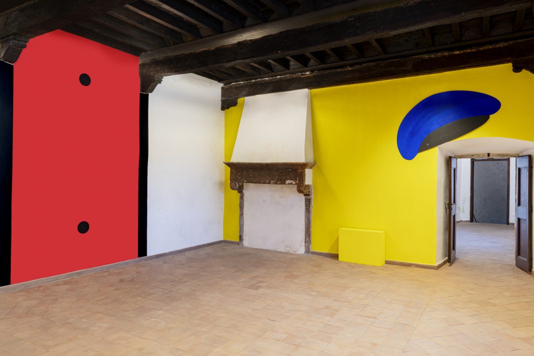 Di fronte a quest’opera, all’apparenza non figurativa in realtà espressione pittorica fortemente gestuale, una composizione pittorica e scultorea matura di Marco Emmanuele introduce gli altri suoi interventi, disseminati nello spazio, accomunati dalla presenza costante del vetro quale principale mezzo espressivo. Alla testa dell’acqua è una scultura in bronzo e vetrofusione velatamente ispirata dalle rappresentazioni medievali della fanciullezza, in dialogo con l’opera di Alessandro Giannì sviluppata da una rlessione sullo statuto contemporaneo delle immagini, pittoriche e non solo, attraverso il dialogo con un’intelligenza artificiale, ironicamente soprannominata Vasari. Uno spazio compreso tra lo zero e l’uomo è invece un gentile intervento site-specific con cui, con fare minimale, Emmanuele applica piccoli fori in una delle finestre del palazzo in cui dispone rametti di rosmarino creando un varco, simbolico ma tangibile, tra lo spazio interno e quello esterno.