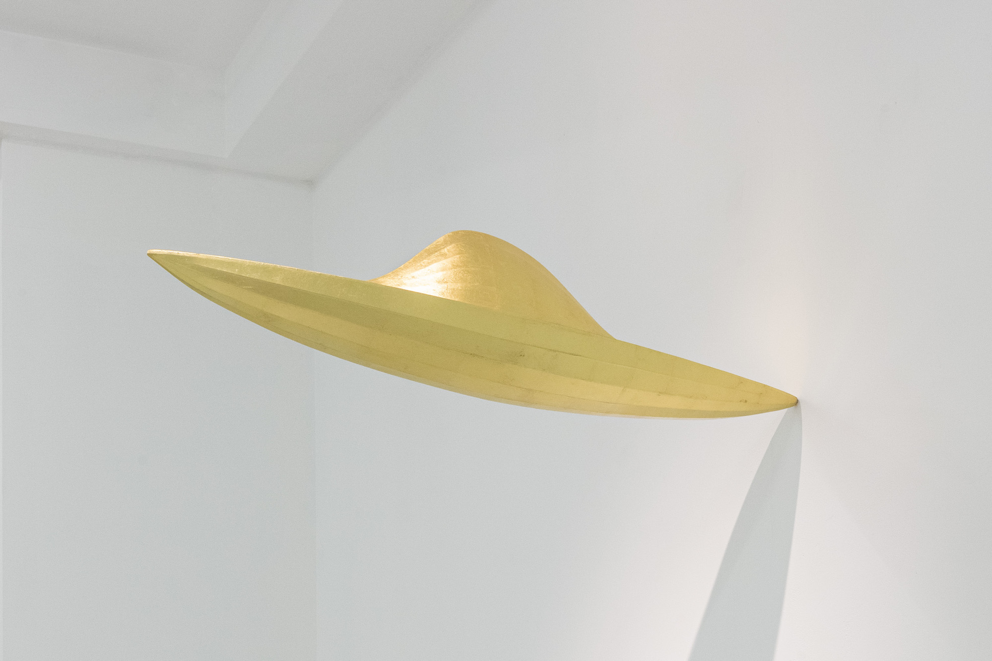 A proposito di architettura e di spazio, la sensazione immediata che si avverte entrando nello spazio della Galleria Thomas Brambilla è quello di uno spazio fisico costruito dall’uomo, di uno spazio artificiale che si mescola con quello esistente integrandosi a esso e attingendo da esso come al proprio necessario alimento, e che tuttavia dal proprio essere artificiale – ovvero letteralmente “inventato” – trae i suoi esiti migliori. Ma andiamo con ordine e risaliamo all’origine dell’ispirazione di Hunt, ovvero i dirigibili del primo Novecento, che ha rivisitato frequentemente a partire dagli anni ‘70. Le opere della serie Airships, che dei dirigibili replicano la forma, sono realizzate in legno di balsa e abete rosso ricoperto di seta e foglie di metallo e sono progettate – e montate – per dare l’impressione di essere sospese nello spazio, sopra le nostre teste e fuori dalla nostra portata, contro ogni apparente previsione gravitazionale.